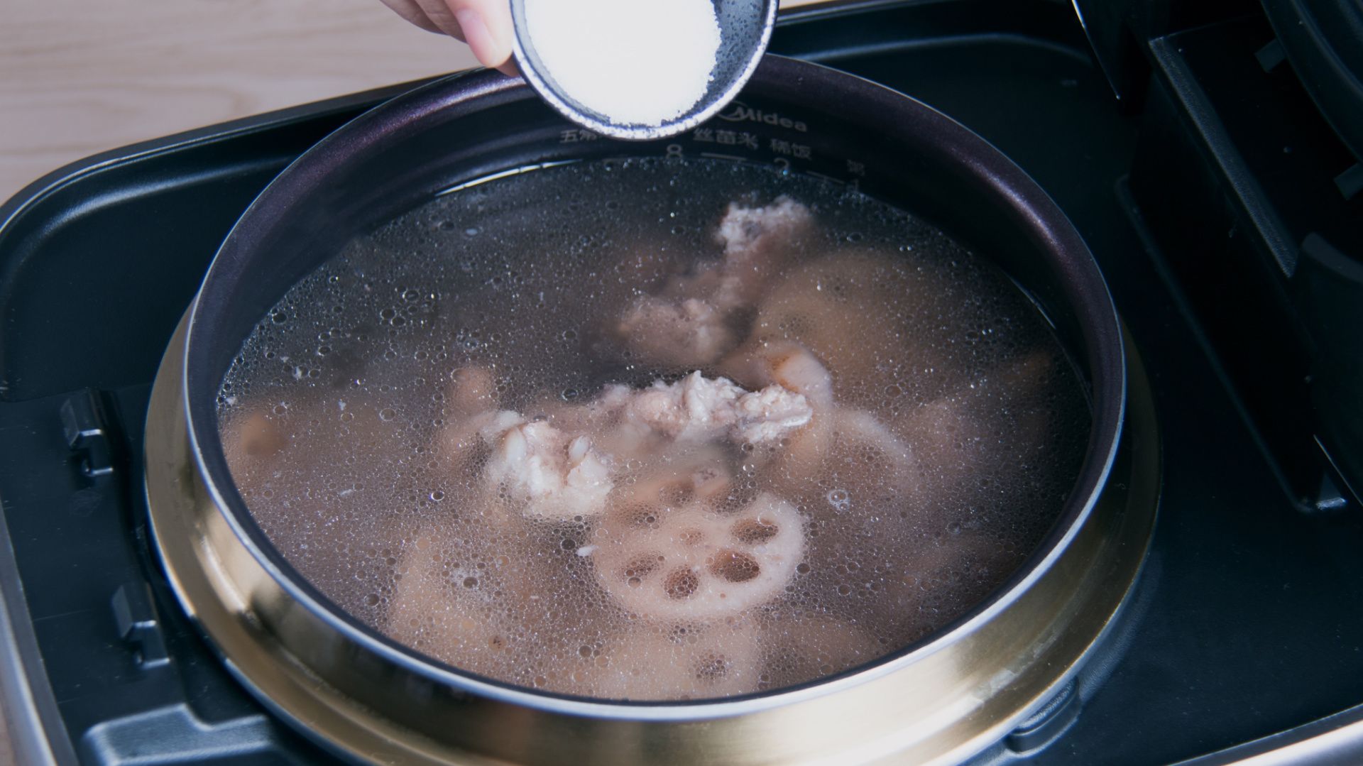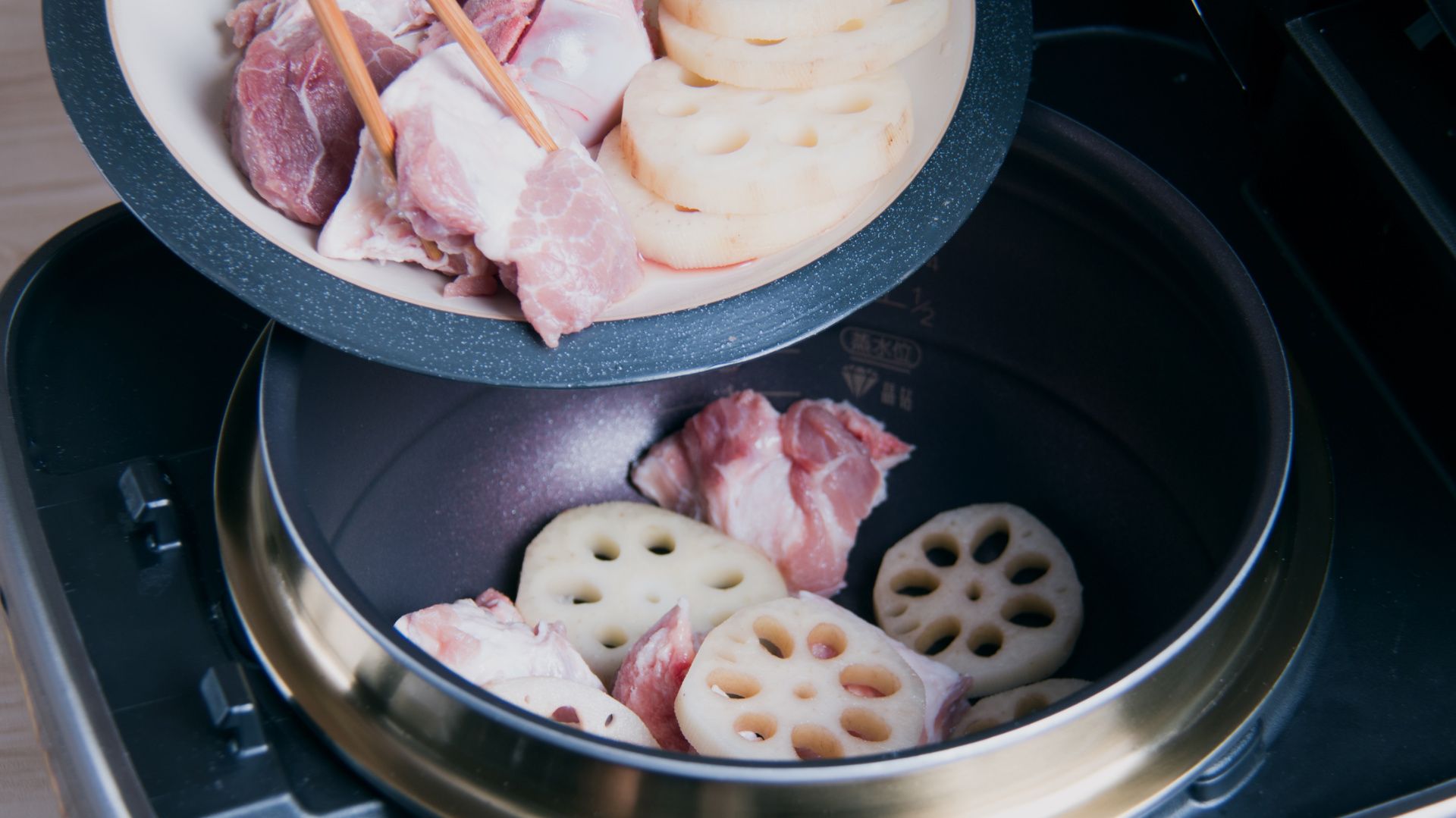 大骨焯水捞出过冷水洗净,将所有食材一起放入内锅