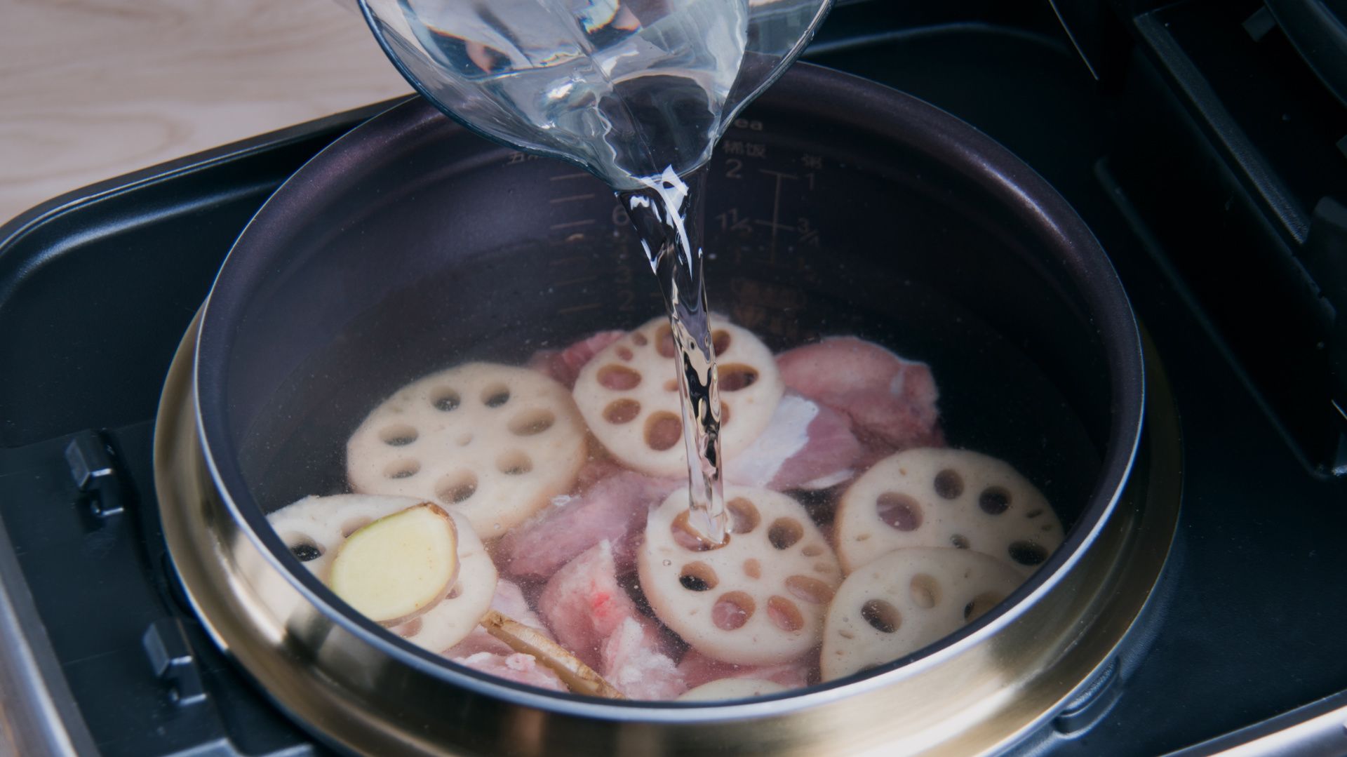 注入清水至煮稀饭2刻度水位,合盖开始烹饪。