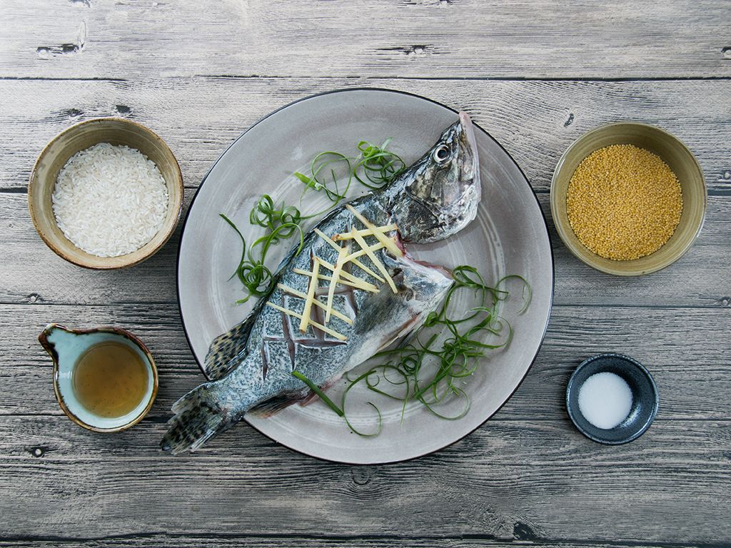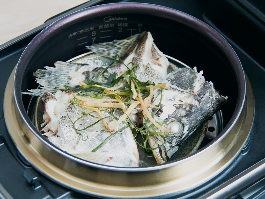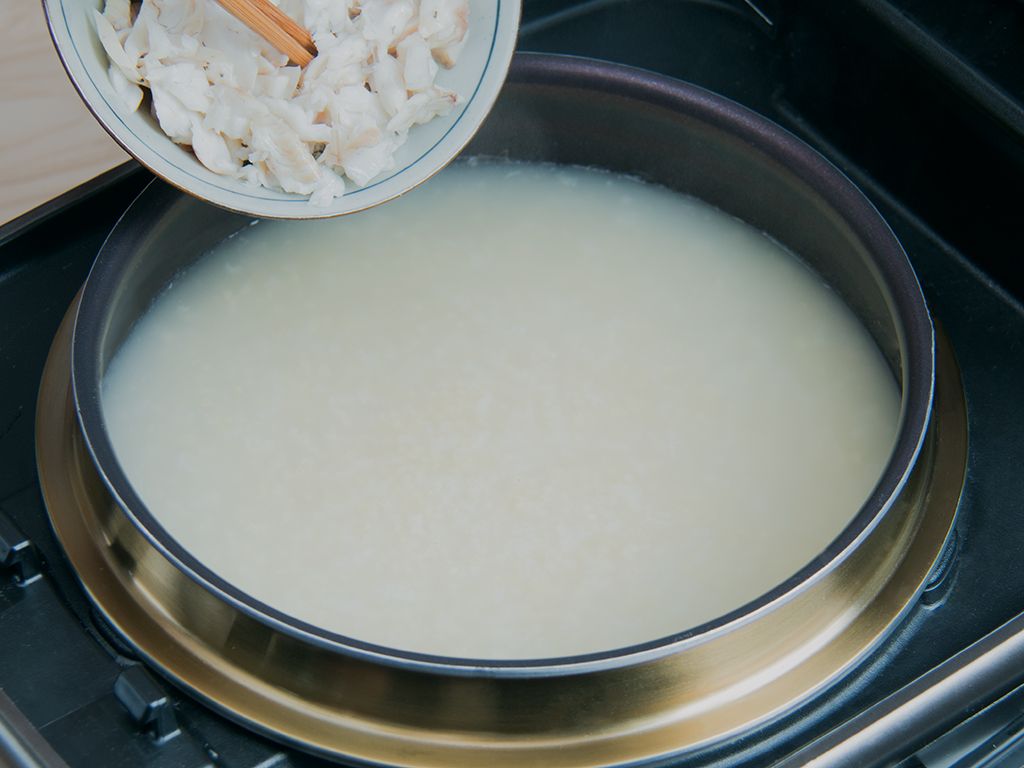 待饭煲烹饪1小时30分钟后加入鱼肉搅匀,合盖继续煮食。