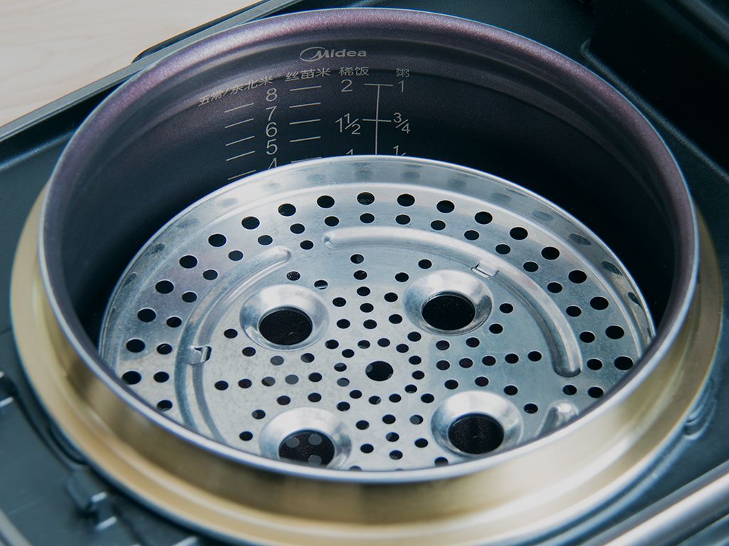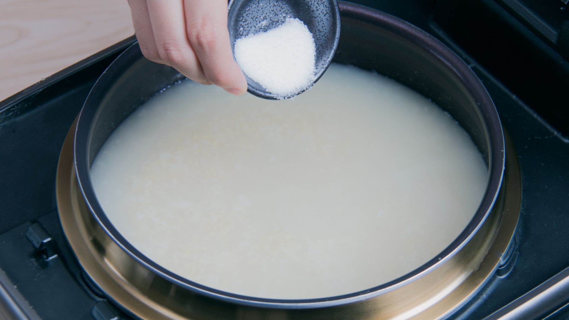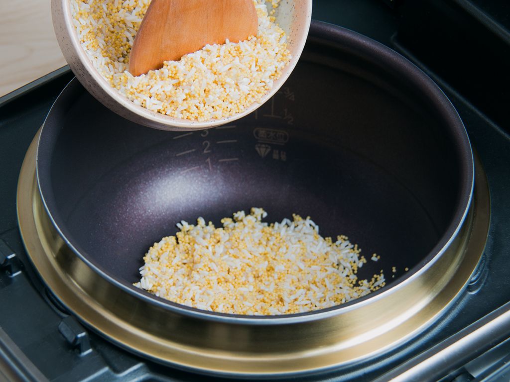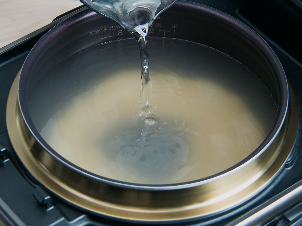 注入清水至煮粥1刻度水位,合盖开始煮食。