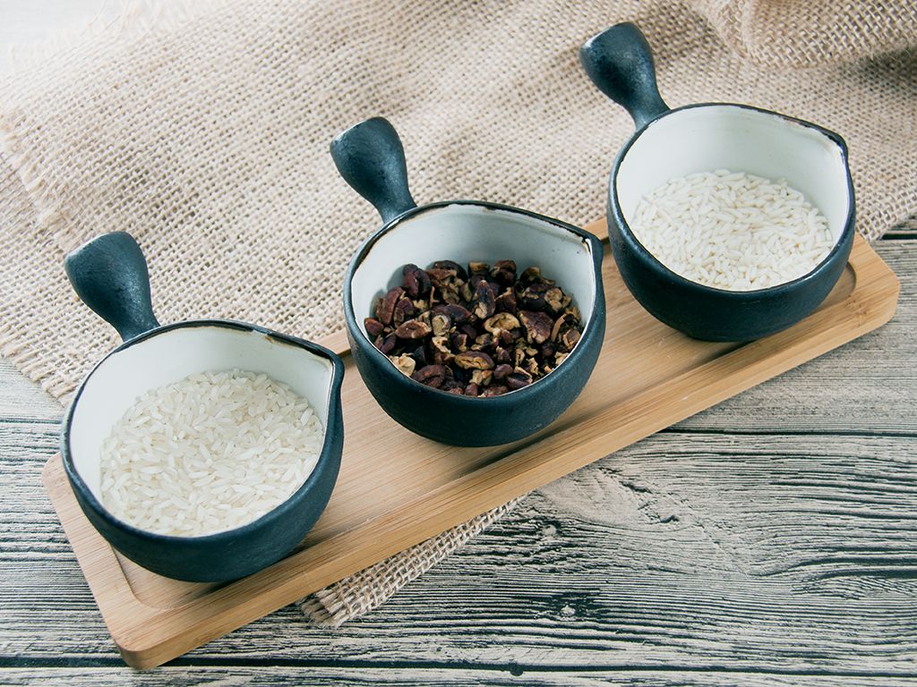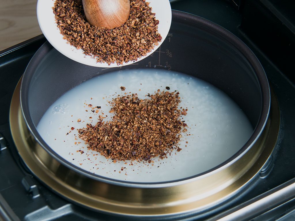 待饭煲烹饪1小时后加入压碎的山核桃仁搅匀,合盖继续煮食。