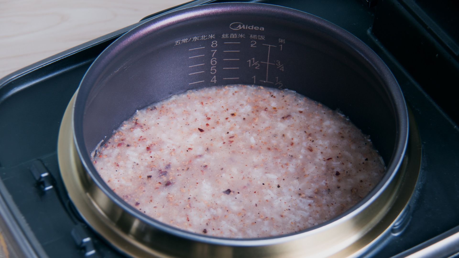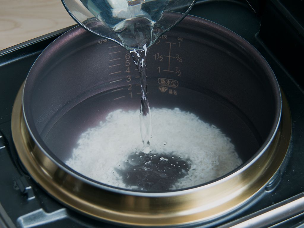 大米淘洗干净,放入锅中,注入清水至煮粥0.5刻度水位,合盖开始煮食。
