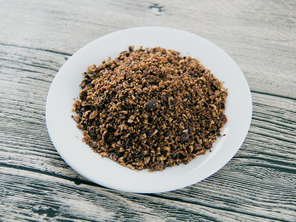 将山核桃仁用煎烤机(炒锅)小火炒熟,用擀面棒压碎。