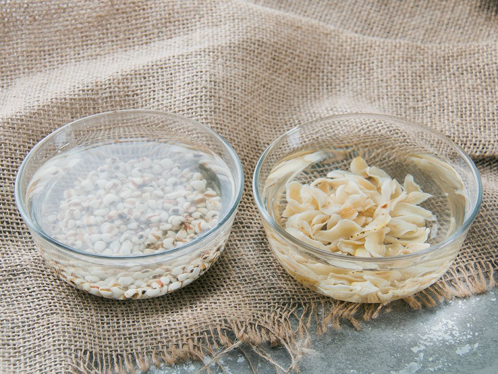 将薏仁、干百合洗净用温水浸泡30分钟。