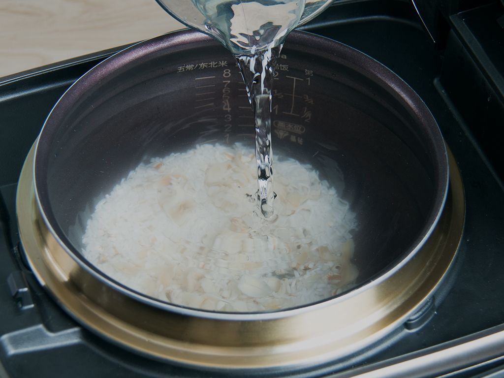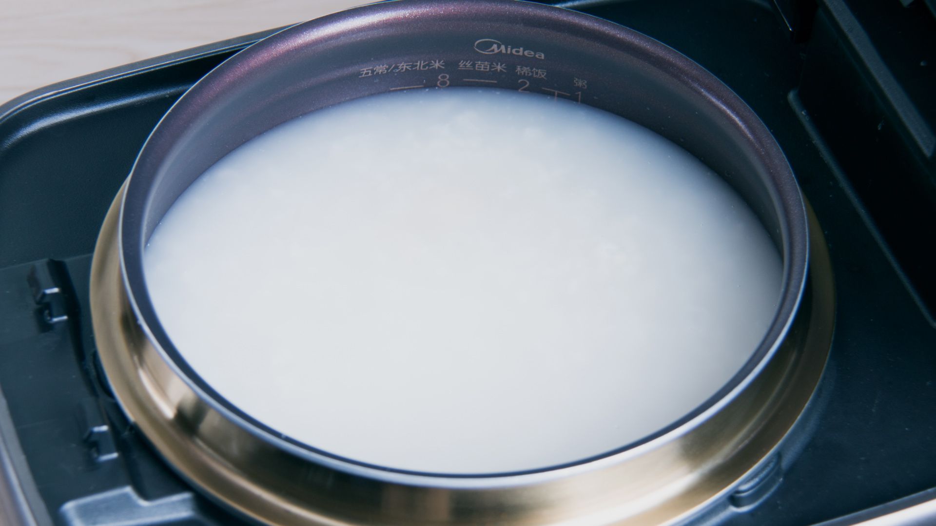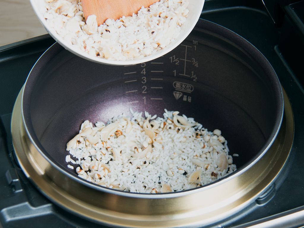 把所有食材放入内锅注入清水至煮粥1刻度水位,合盖开始煮食。