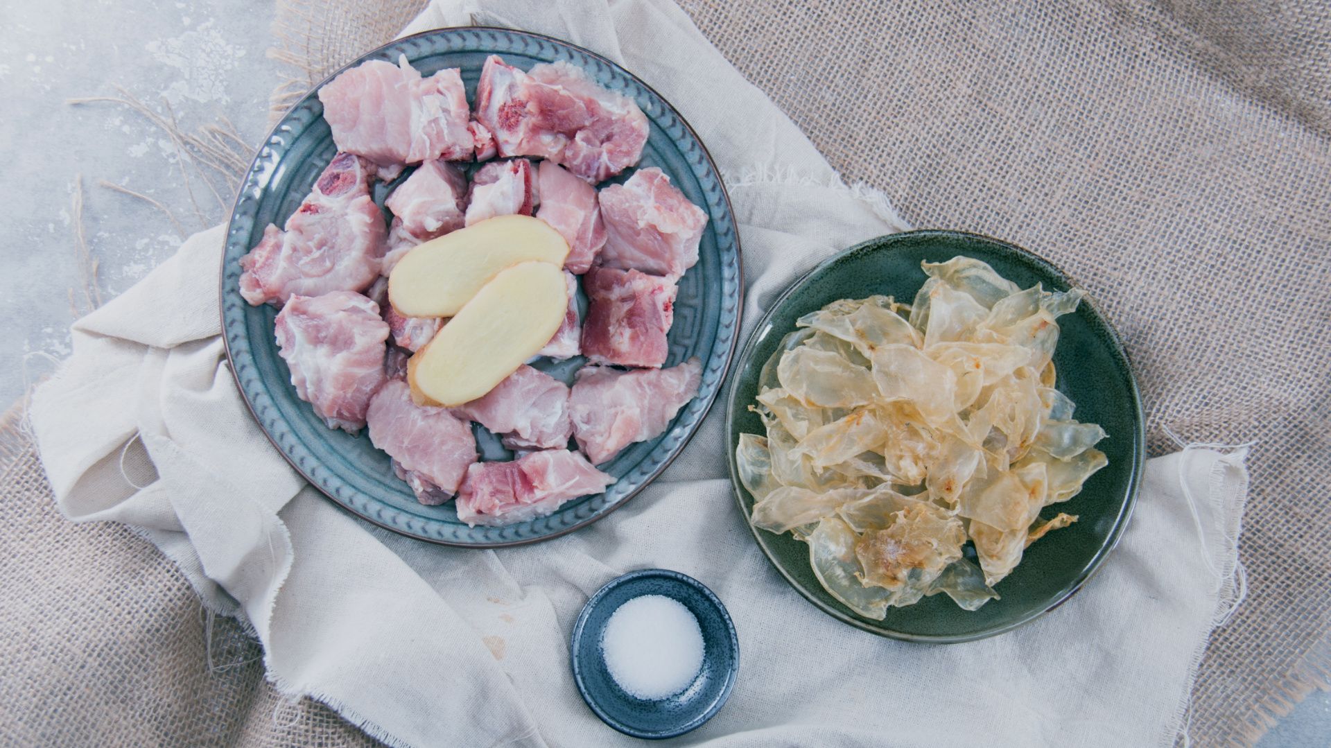 准备好所有材料,猪龙骨清洗干净,剁块焯水捞出,泡松软的花胶清洗干净用剪刀剪成块备用。