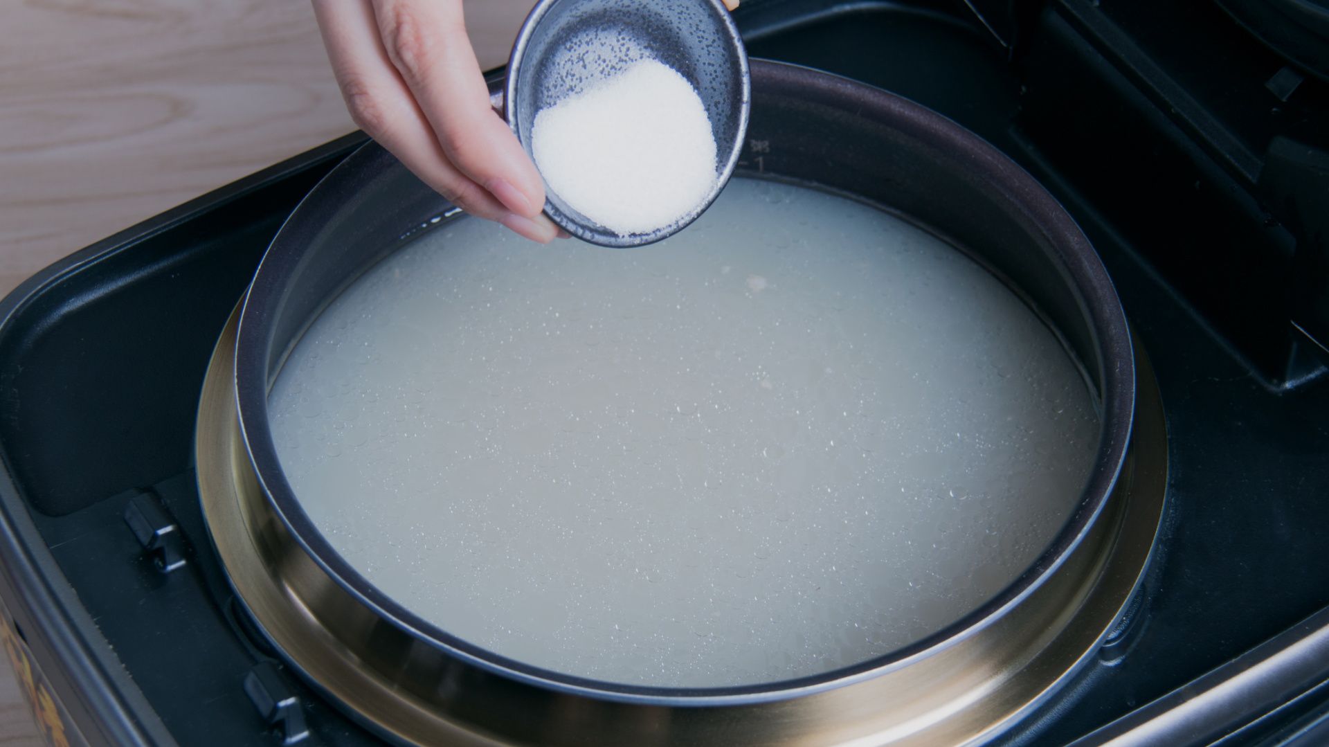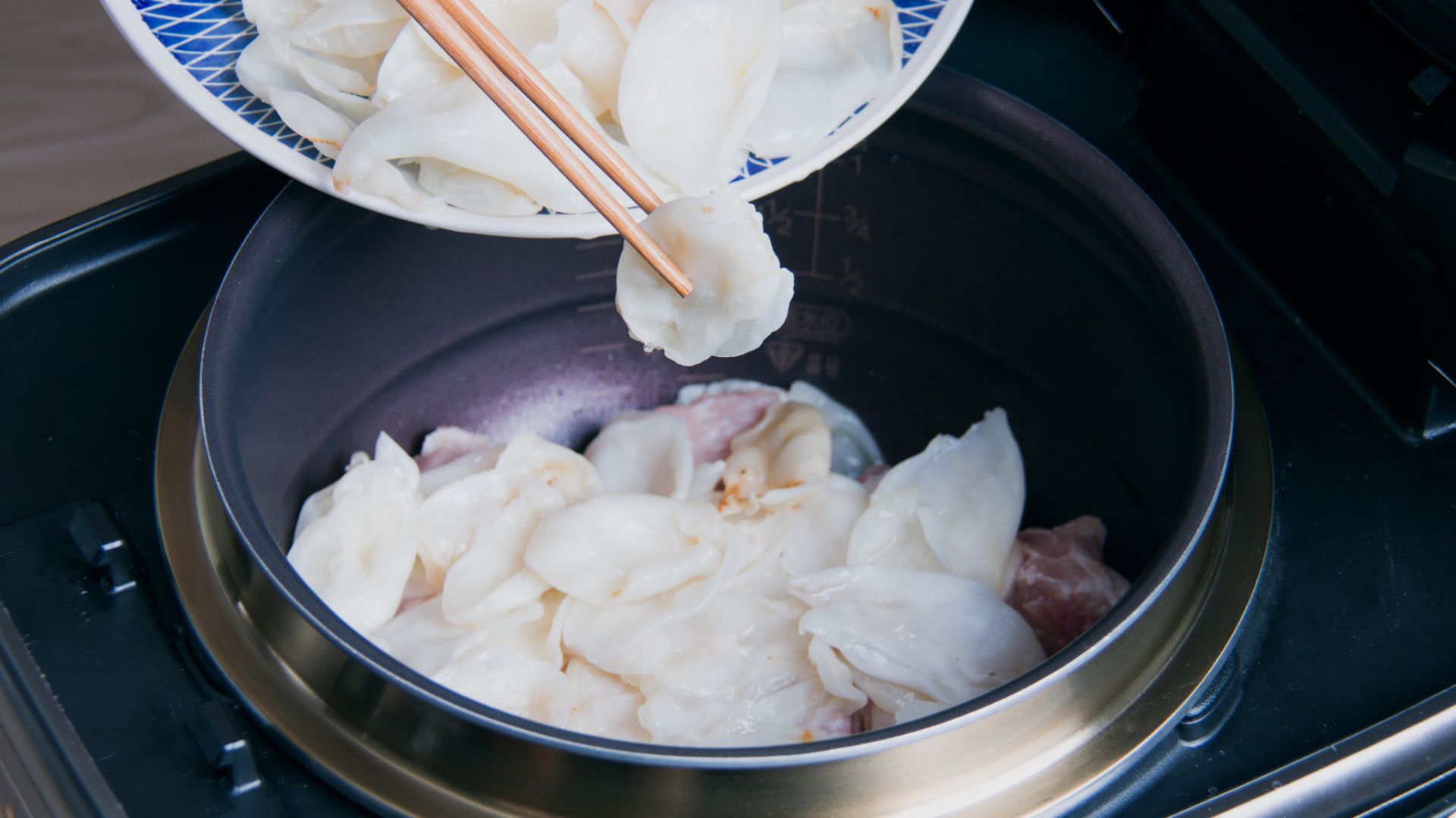将所有食材一起放入内锅,注入清水至煮稀饭2刻度水位,合盖开始烹饪。大火煮开3分钟左右转小火煲大概2小时