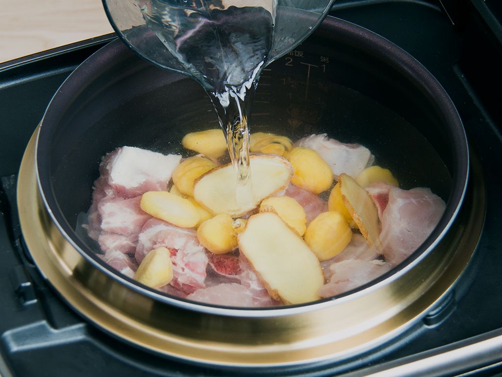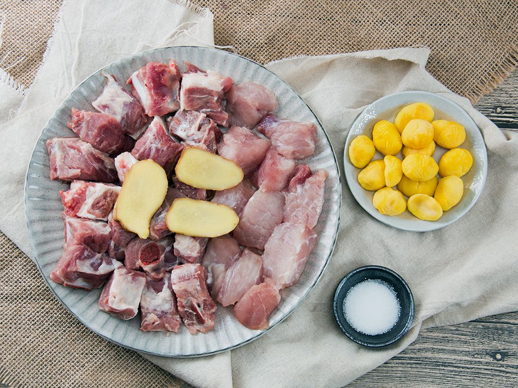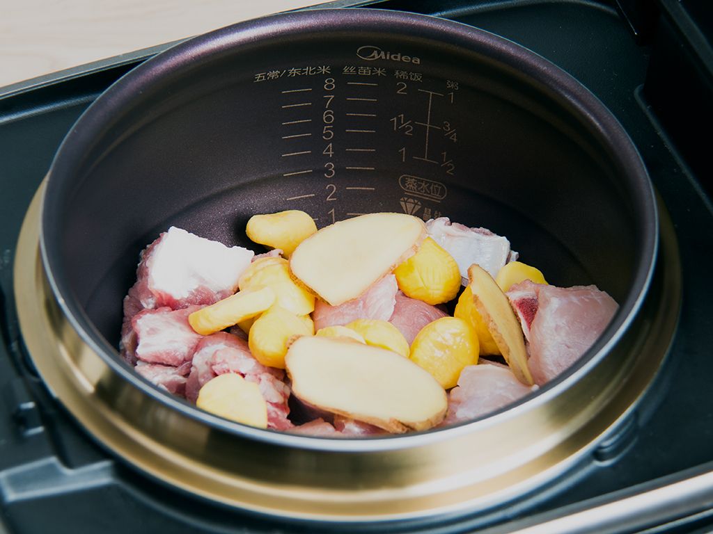 将排骨、瘦肉、栗子和姜片一同放入内锅。
