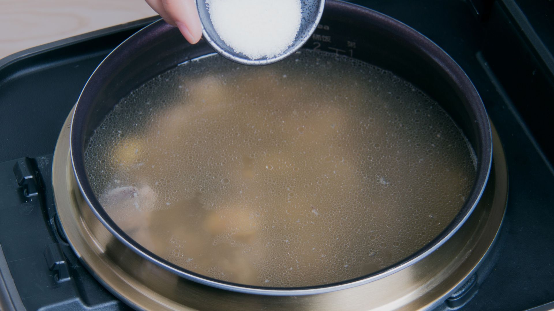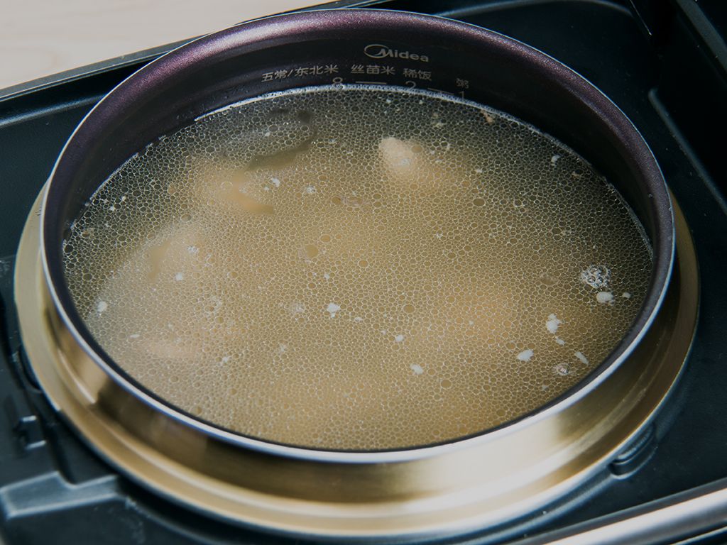 注入清水至煮粥1刻度水位。