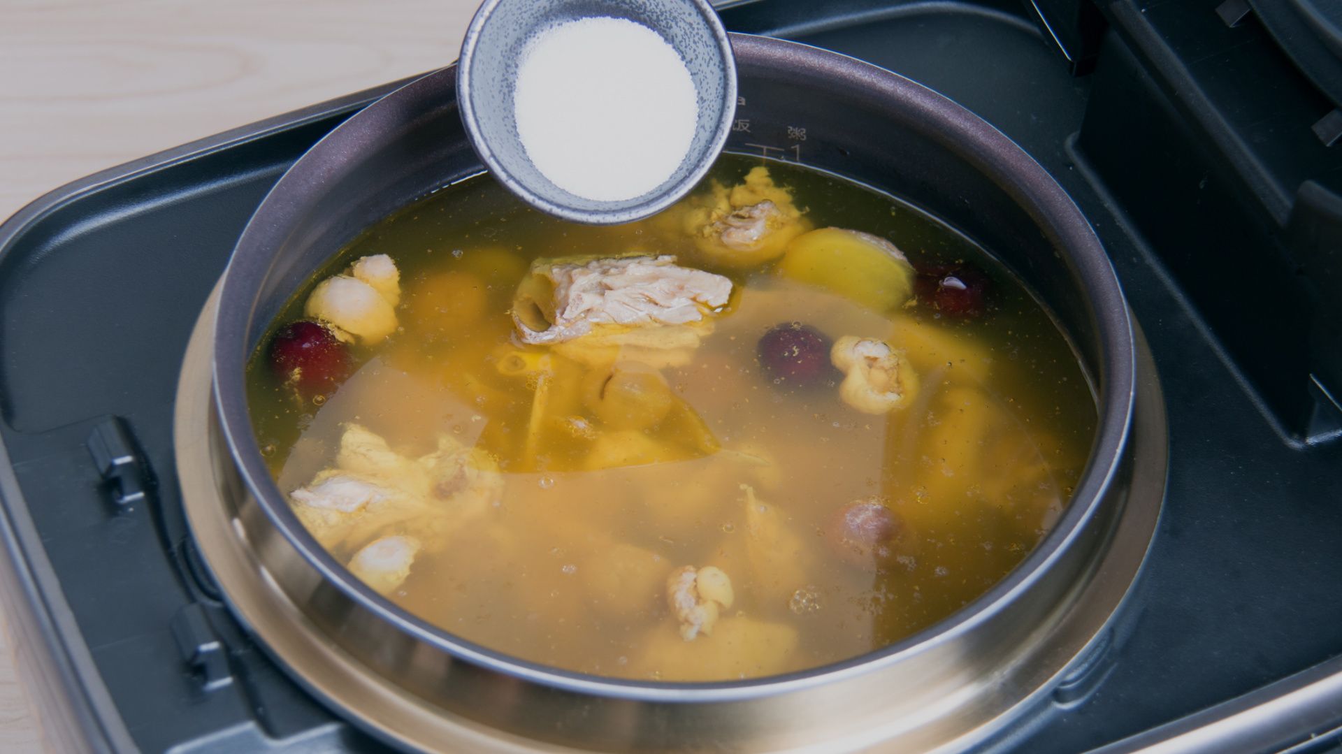 结束后加盐调味即可食用。