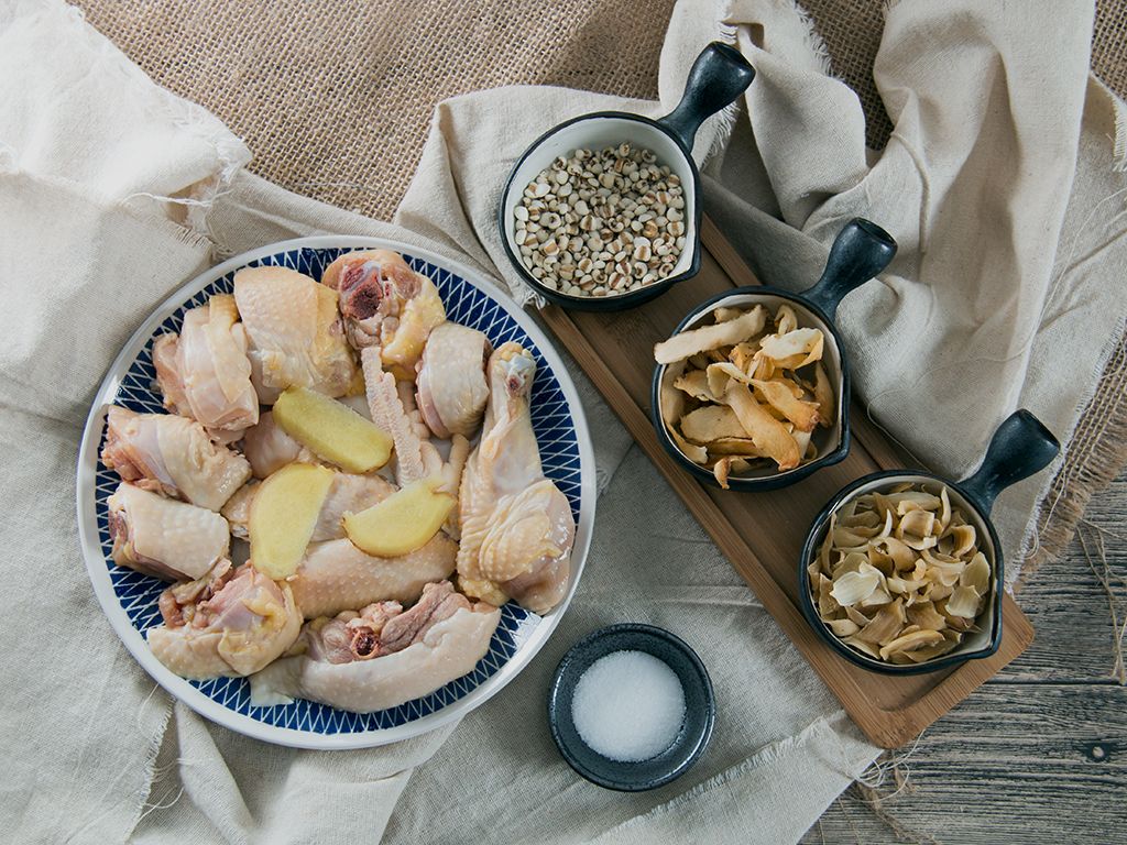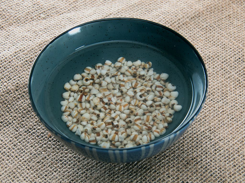 薏米洗净,用清水浸泡30分钟;百合洗净;姜洗净切片备用。