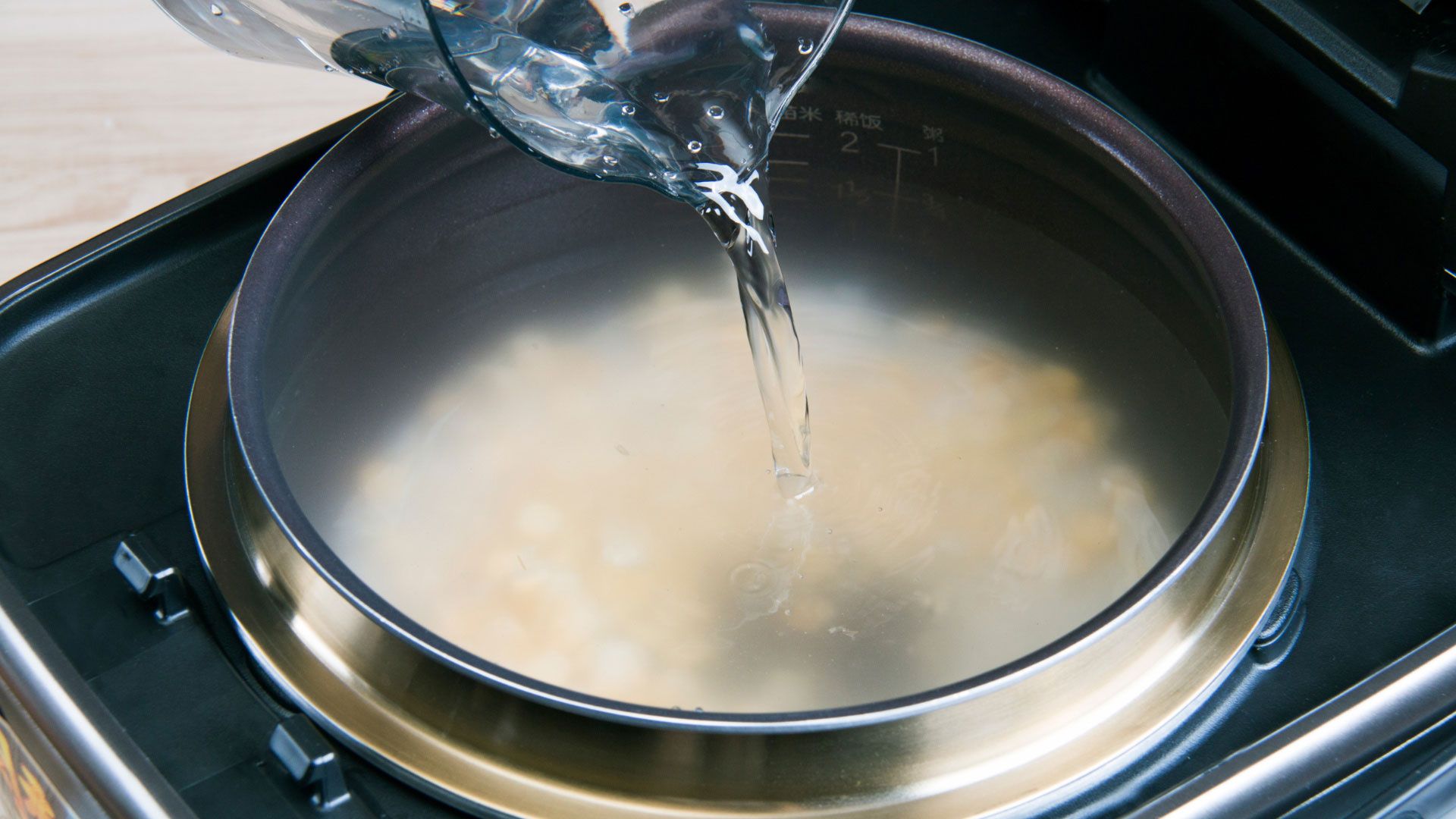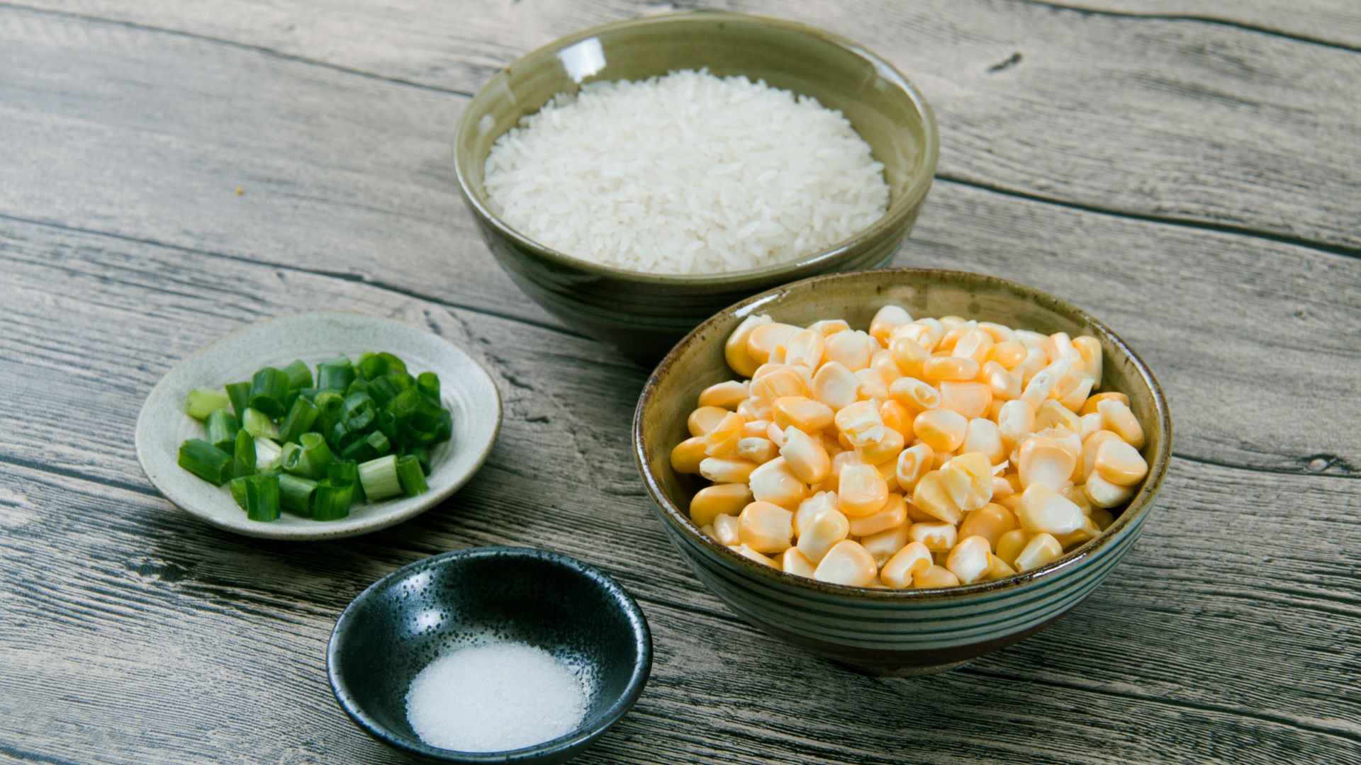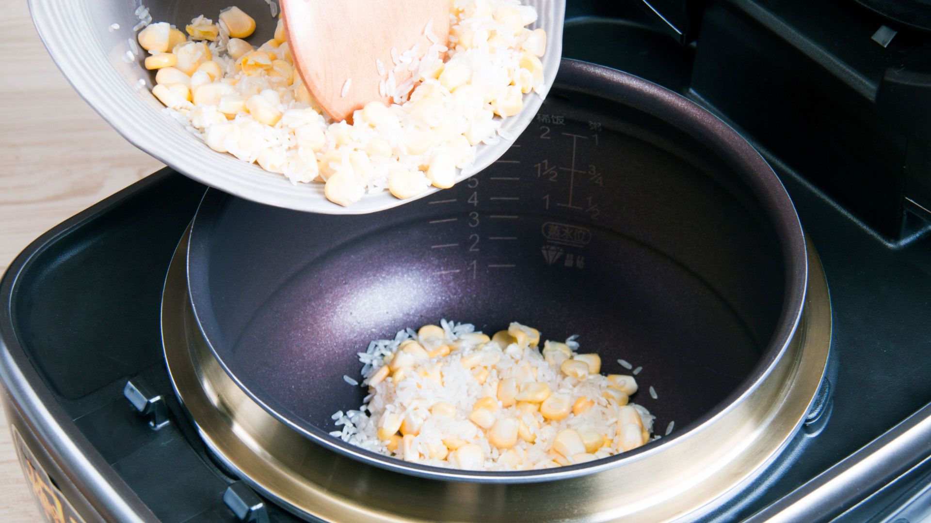 大米洗净沥干,把玉米粒一同倒入内锅,加水至煮稀饭2刻度水位,合盖开始烹饪。