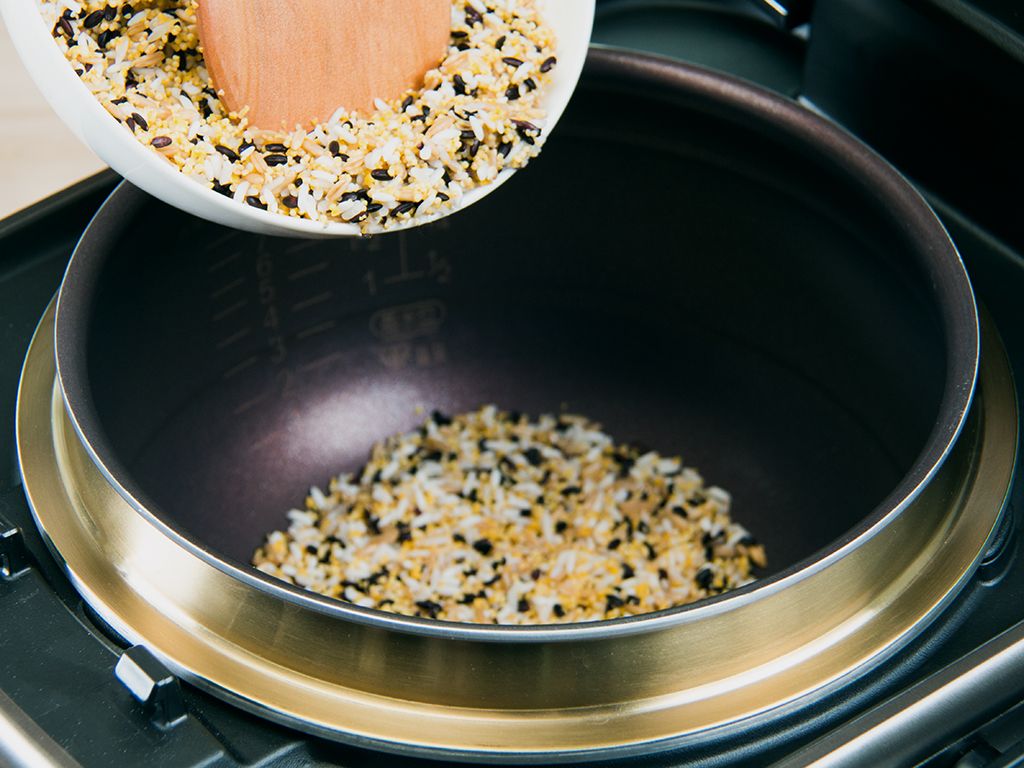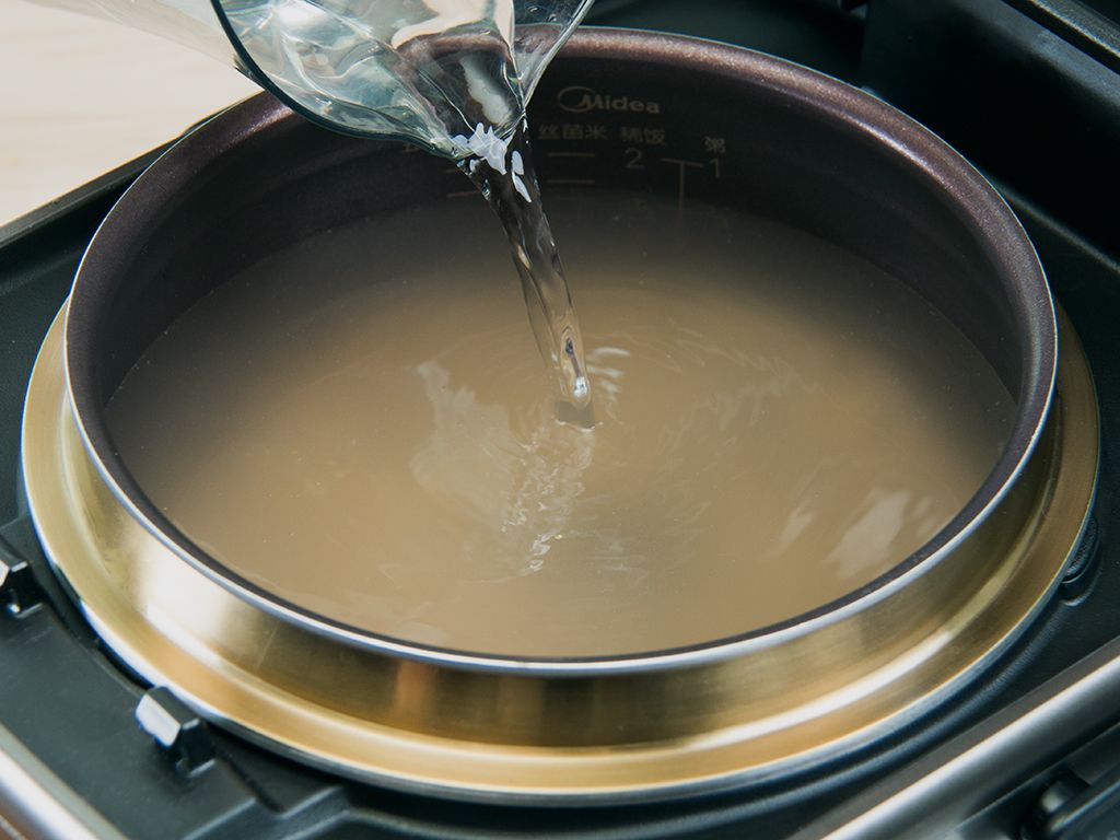 浸泡好后加入大米、糯米、小米一起洗净沥干,倒入内锅