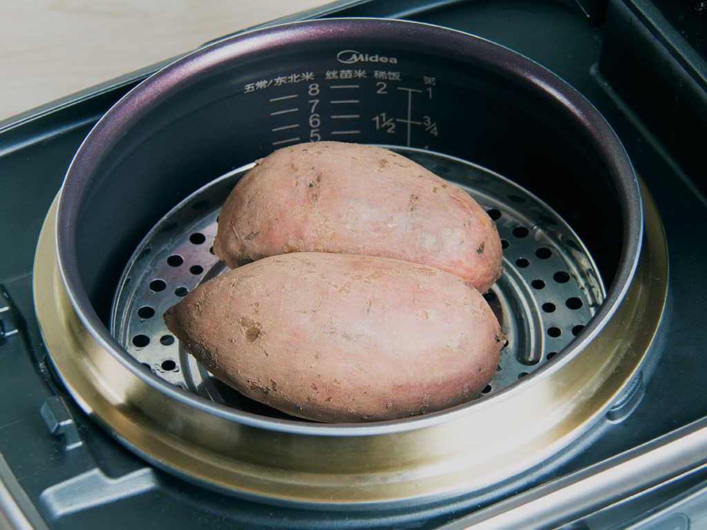 内锅放上蒸笼、摆入红薯(大块的需切开)。合盖开始烹饪,结束后即可食用。