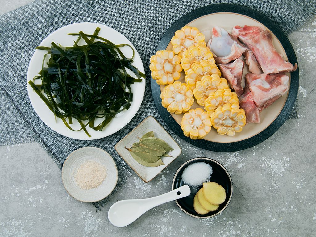 准备好食材,大骨焯烫去污洗净,玉米切块,海带切丝,姜切片待用。