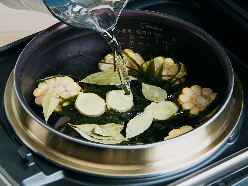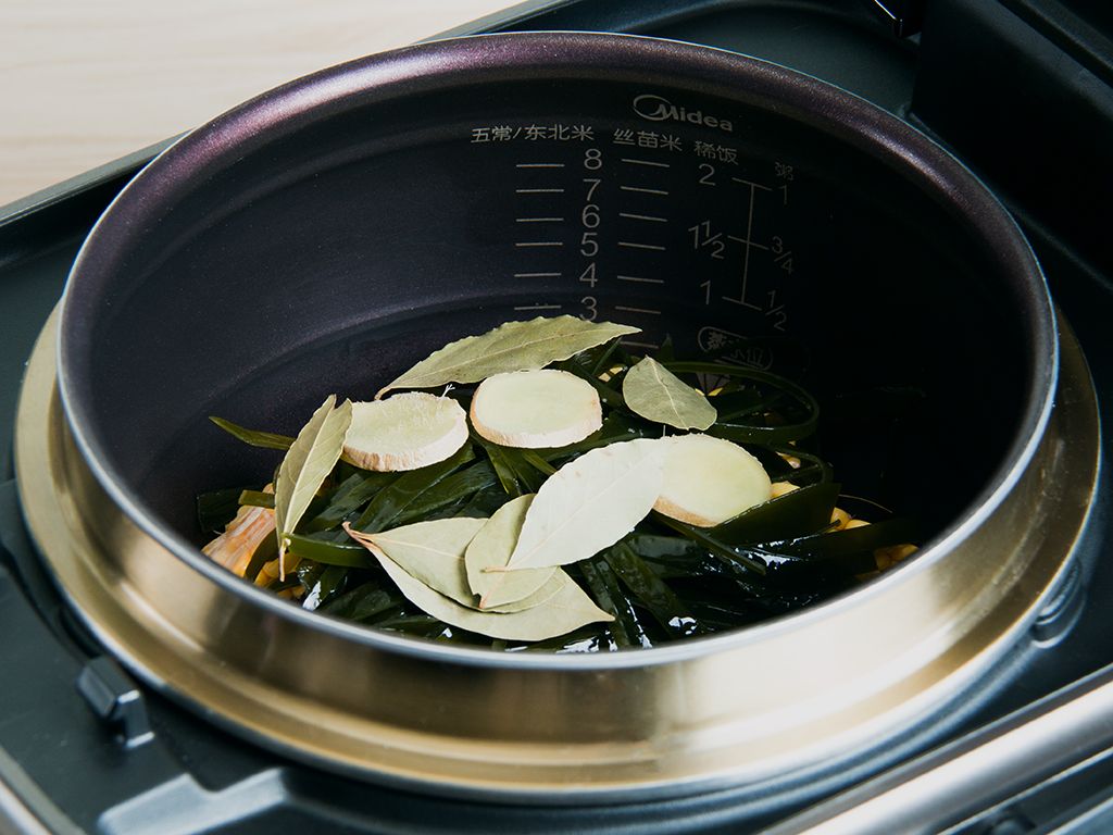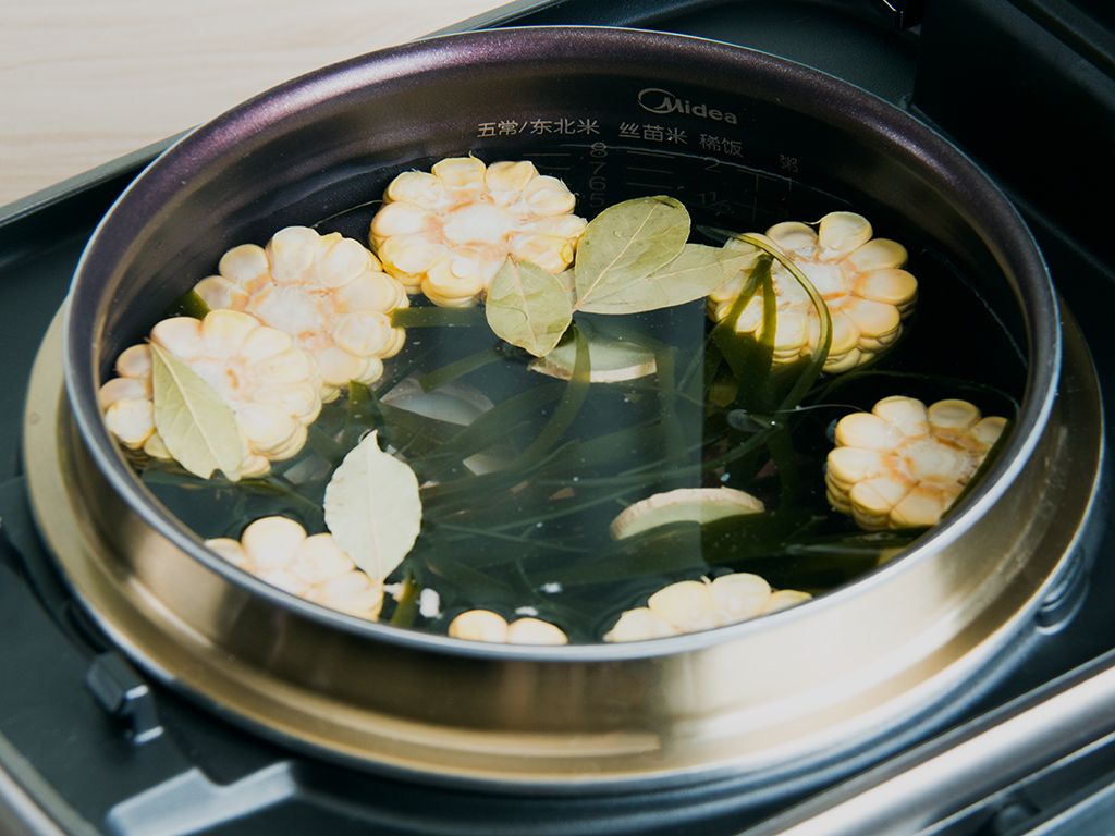 将大骨、玉米100克、海带75克、姜10克、白醋5毫升、香叶0.1克(一片)放入饭煲内锅。