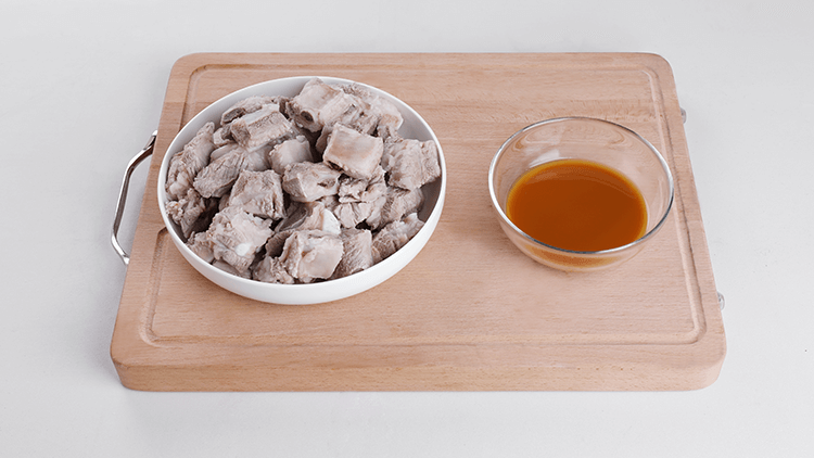 1、排骨剁成段,焯水洗净。 2、淀粉 1大勺、生抽 1大勺、水2大勺调匀备用。