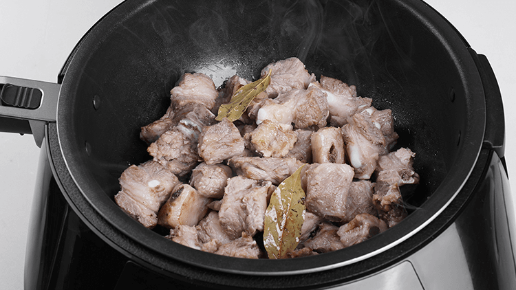 1、放入排骨、白砂糖 1大勺、花椒0.3大勺、香叶3片。