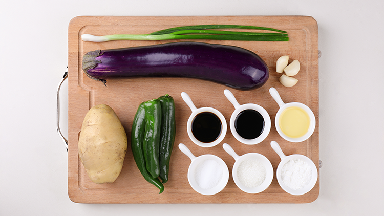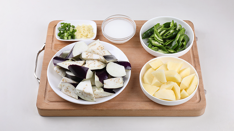 茄子和土豆切块,青椒切成菱形块,葱切葱花,蒜瓣切成蒜泥; 淀粉和水混合均匀成淀粉水备用。