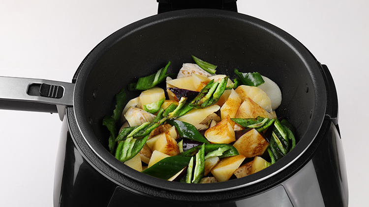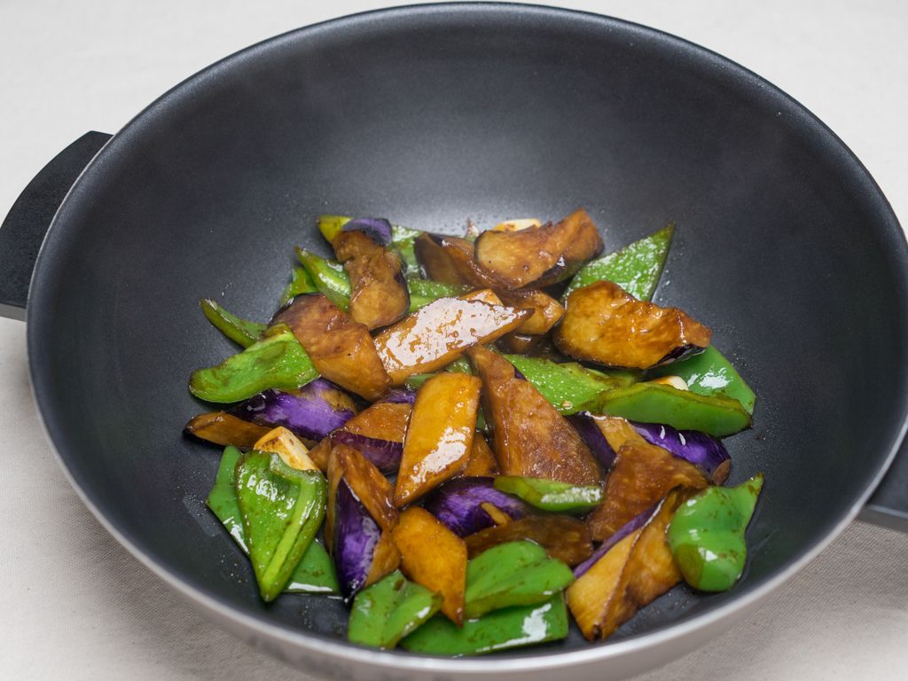 将土豆、茄子、青椒和其它原料放入锅中翻炒片刻