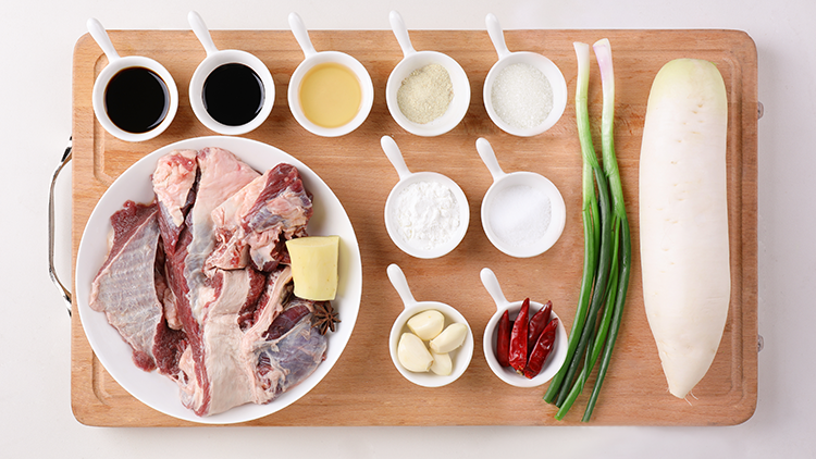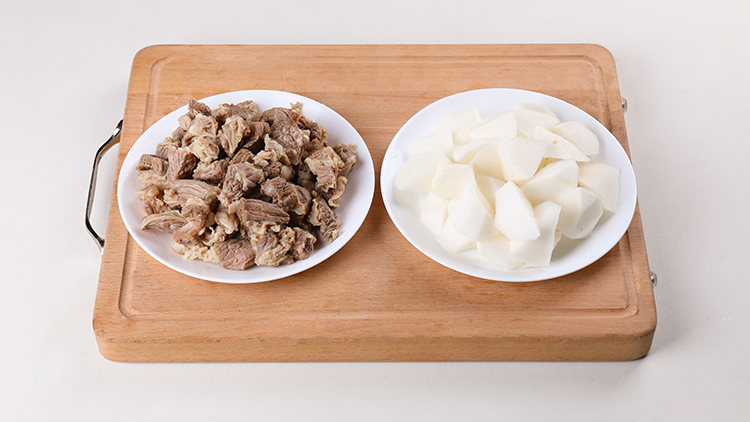 牛腩切块焯水洗净备用,白萝卜去皮切块备用。
