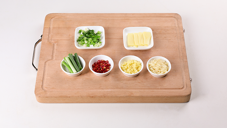 葱切成葱段和葱花,各备一份;姜切成姜片和姜碎,各备一份;蒜瓣、干辣椒切碎。