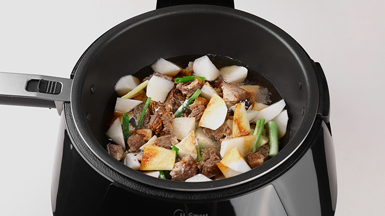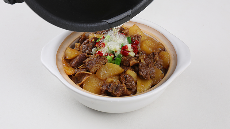 将牛腩和其它原料(除葱花、姜碎、蒜碎和干辣椒碎)加入锅中,启动程序。