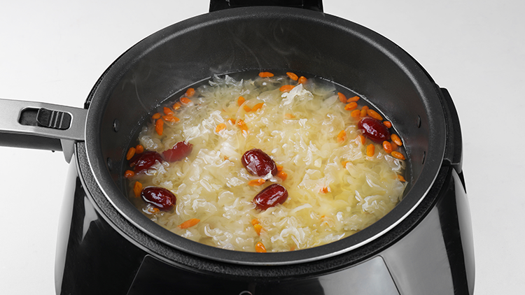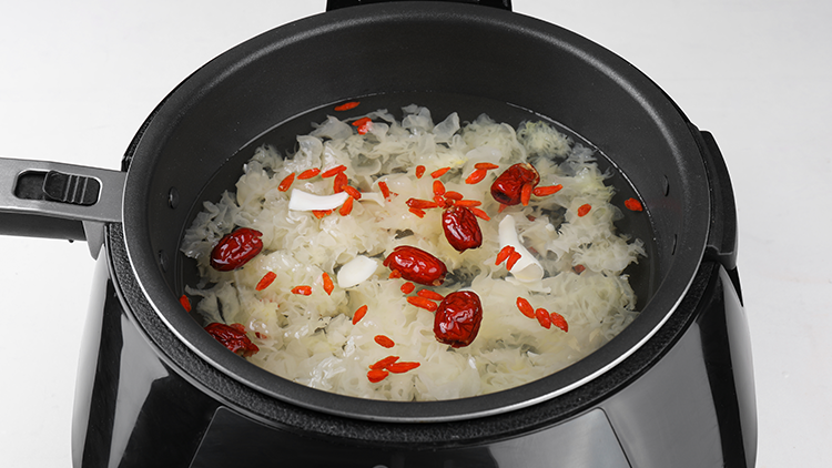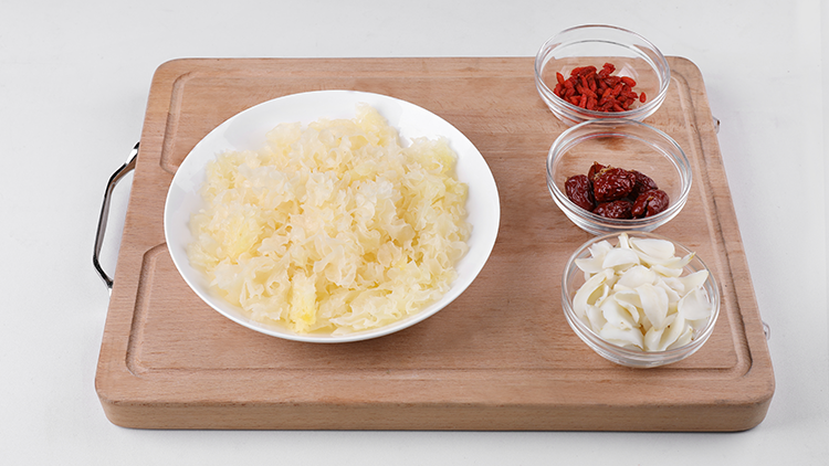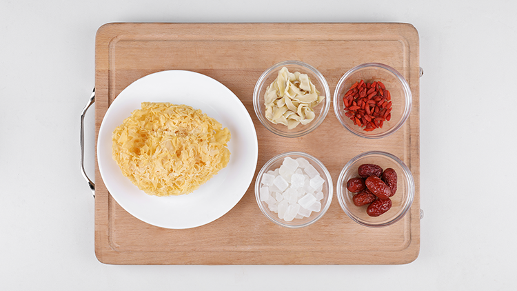 干百合、干银耳清水泡发0.5小时,去蒂根,撕成小朵;红枣洗净去核;枸杞洗净。