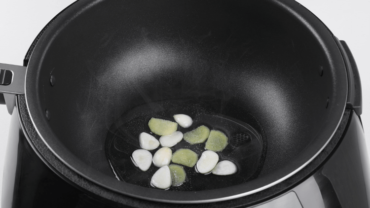 1、放入食用油3大勺、生姜5片、蒜瓣3瓣煎香