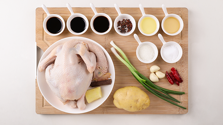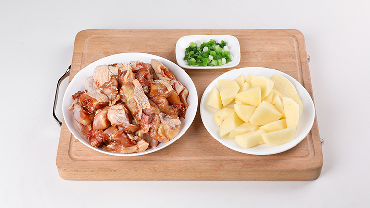 将鸡斩成块和盐、生抽、老抽腌制10分钟,土豆切块,葱切葱花备用。