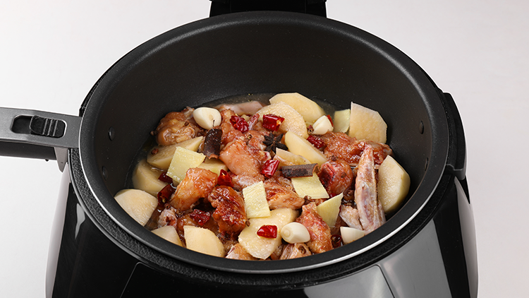 炒锅热油,爆香葱姜蒜、干红辣椒;放入鸡块煸炒片刻至鸡块颜色发白,调入郫县豆瓣酱;翻炒片刻后再加老抽、生抽、冰糖炒匀。然后倒入没过材料的温水大火煮开后开中小火炖煮;约5分钟后加入土豆块同煮