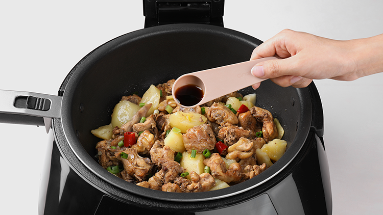 炖至土豆软糯,汤汁浓稠,加青椒、葱调味,大火收稠汤汁即可搅拌均匀出锅。