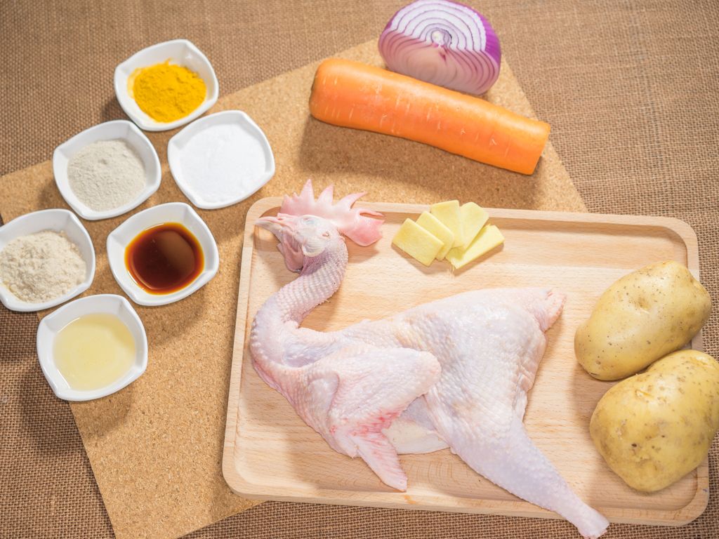将鸡切块过水,土豆切块,胡萝卜切块,洋葱切末