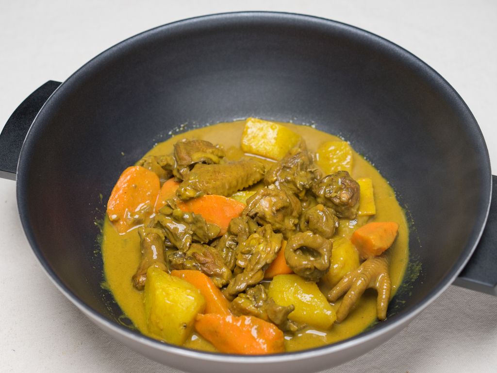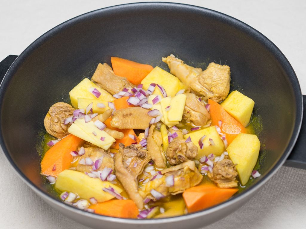 2、先将鸡烧酥软,再放入咖喱卤汁中,略烧片刻,使之入味,注意不要粘锅。