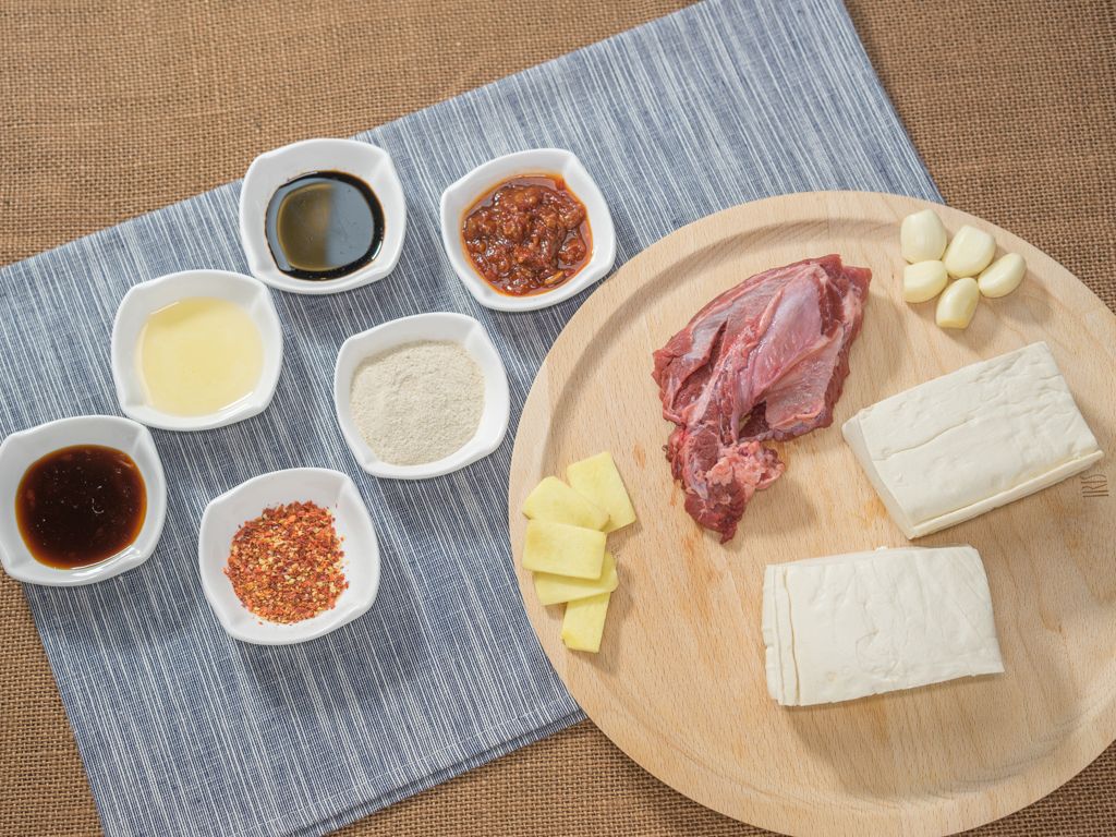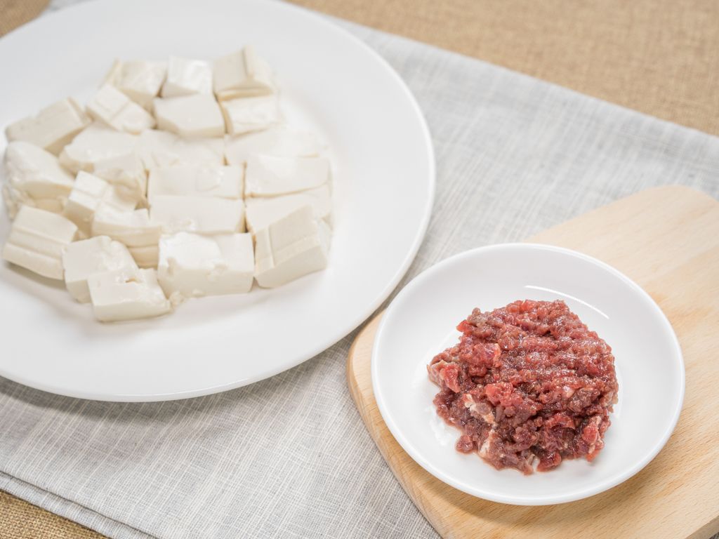 将豆腐切块,牛肉切末