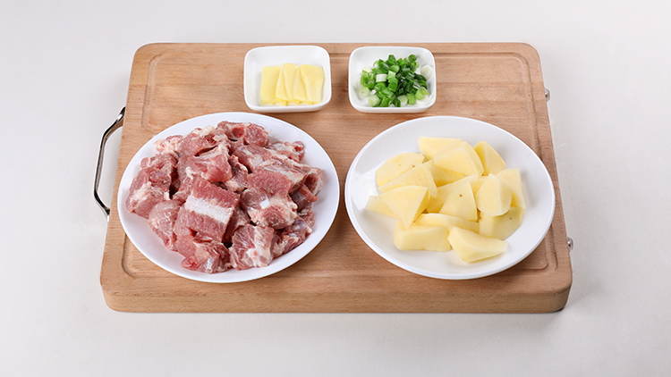 排骨剁成段,土豆切块,葱切葱花,生姜切片。