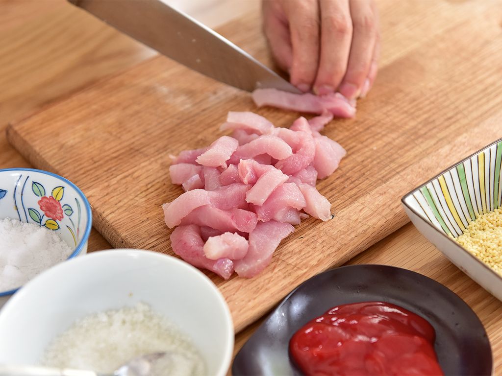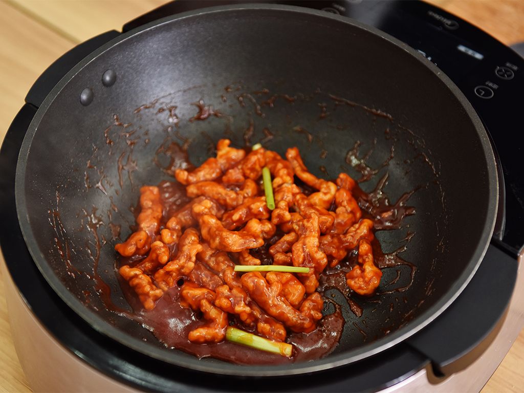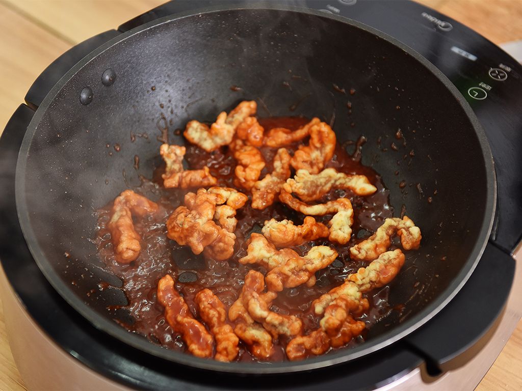 腌制好的里脊肉裹上适量淀粉,并拍去多余淀粉。起锅热油烧至六分热(160度左右),放入裹好粉的里脊肉,中小火炸至熟透时捞出;待油锅烧至九分热(190度左右),复炸第二次,大火炸至表面金黄酥脆,捞出备用。