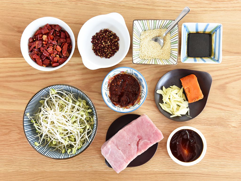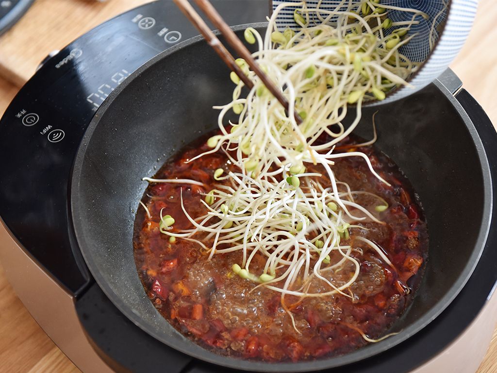 用锅中油爆炒豆瓣辣酱,然后将葱白、姜、酱油、胡椒粉、鸡精等调料放入,略搅几下,使之调匀将其余调料全部加入锅中搅拌均匀,加水,下豆芽
