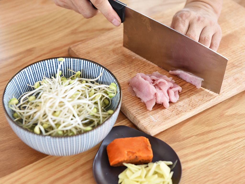 将猪里脊肉切片,鸡蛋清和淀粉、盐、料酒调匀成糊,涂抹在肉片上。豆芽洗净