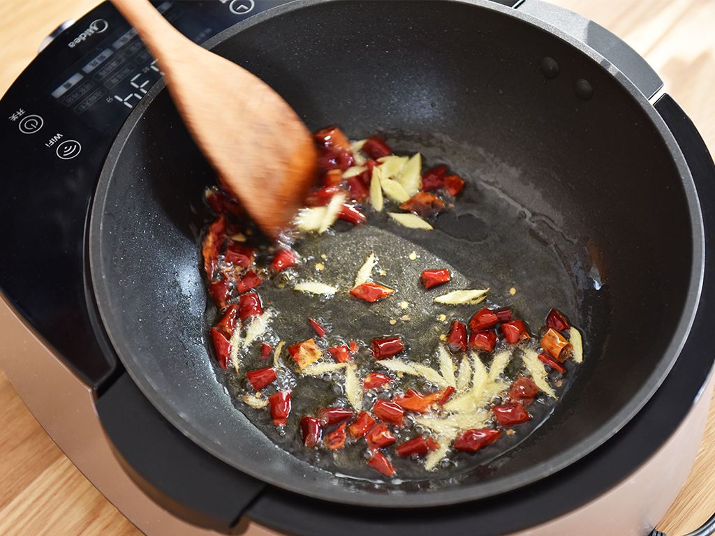 将切成丝的生姜与切成段的辣椒、油放入锅中炒香