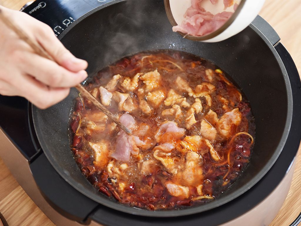 下里脊肉片分片放入,肉片熟后,将肉片盛起,将剁碎的干辣椒、花椒末撒上,用剩余的植物油烧开,淋在肉片上,使热油把干辣椒、花椒粉、肉片再炸一下,即可使麻、辣、浓香四溢