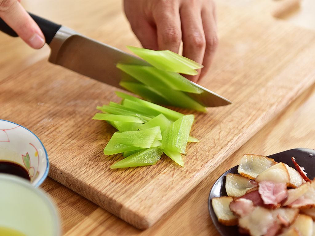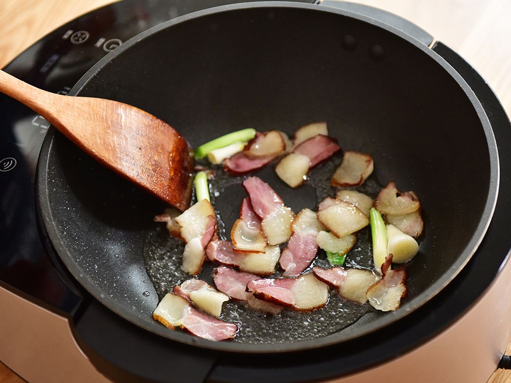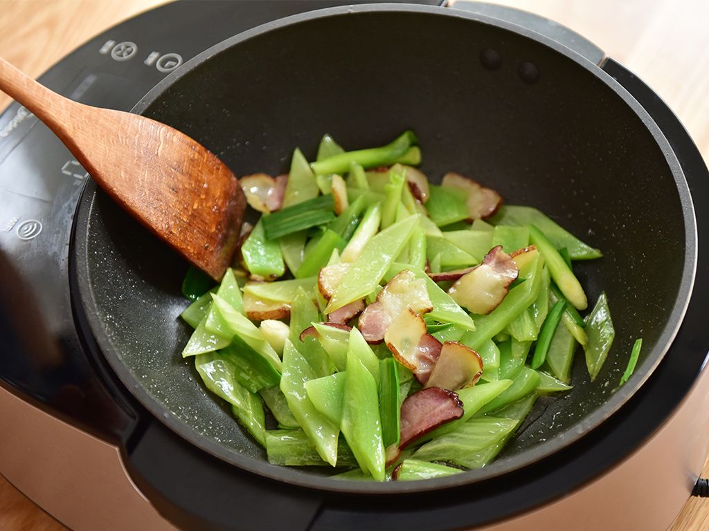 锅热倒油,放入腊肉,小火慢煸,等有点卷边,发黄了,放入葱蒜碎,辣椒段煸炒,出香味后,放入莴笋,快速翻炒,加入生抽、盐等调料调味