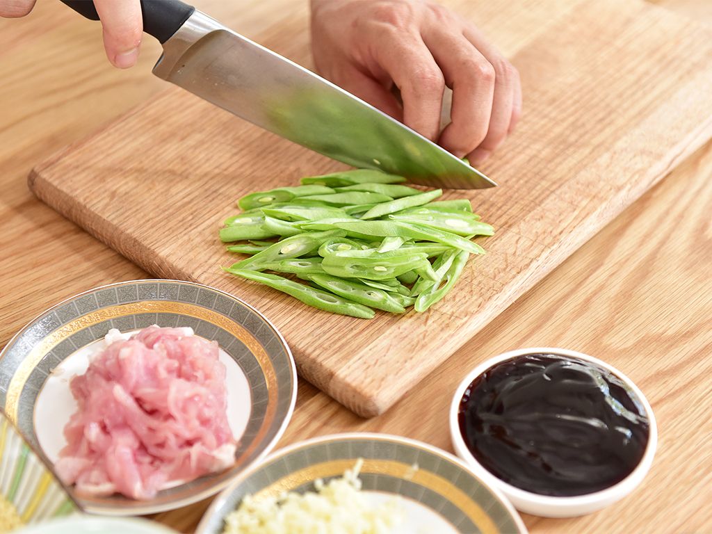 将瘦肉切丝用生抽、料酒、水淀粉抓匀、 四季豆用手掰断两头,把两边的筋撕掉然后切片。将四季豆放到滚盐水中煮两分钟,捞出四季豆,沥干水分。