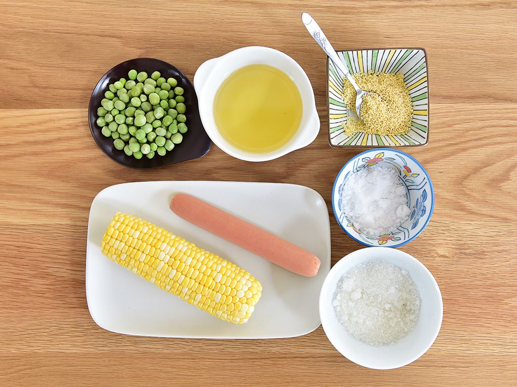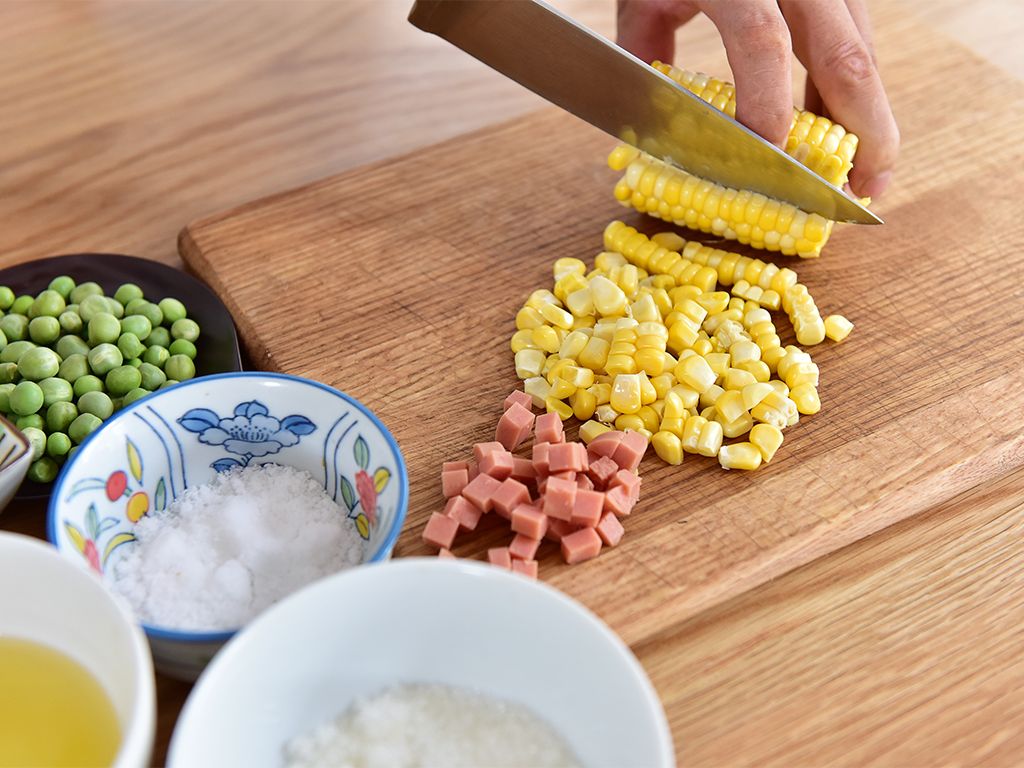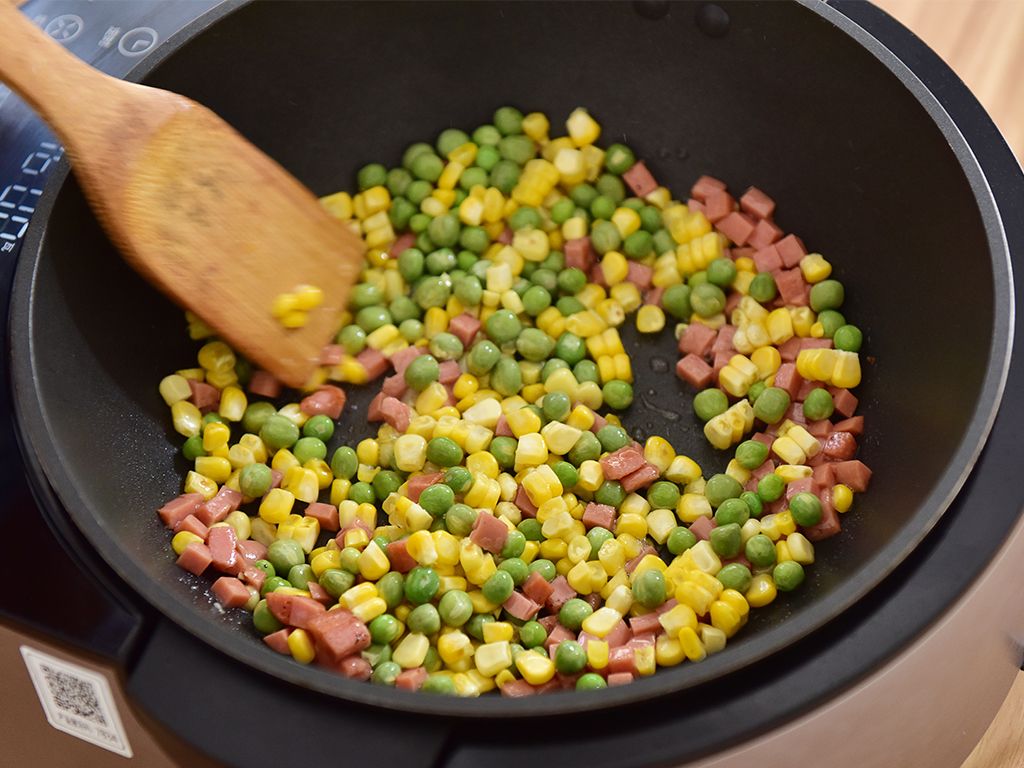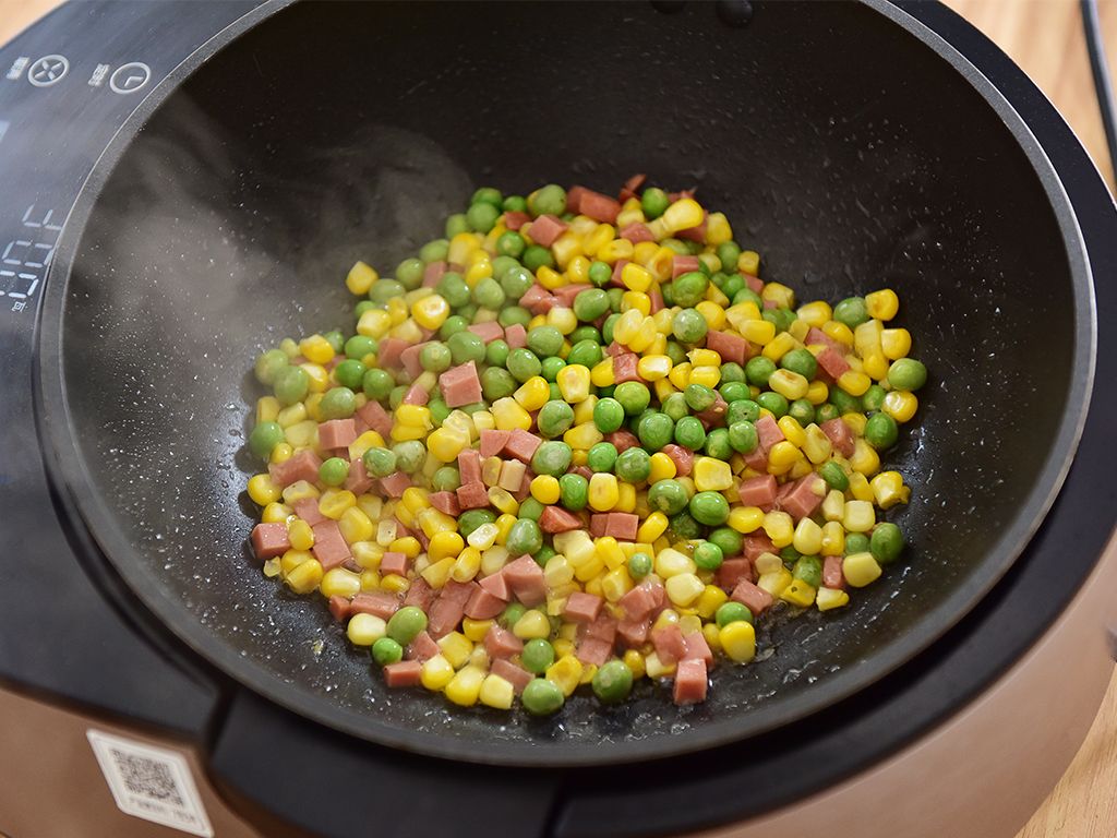 锅热倒油,放入豌豆粒翻炒片刻,再放入玉米粒、火腿粒,加入适量调料翻炒