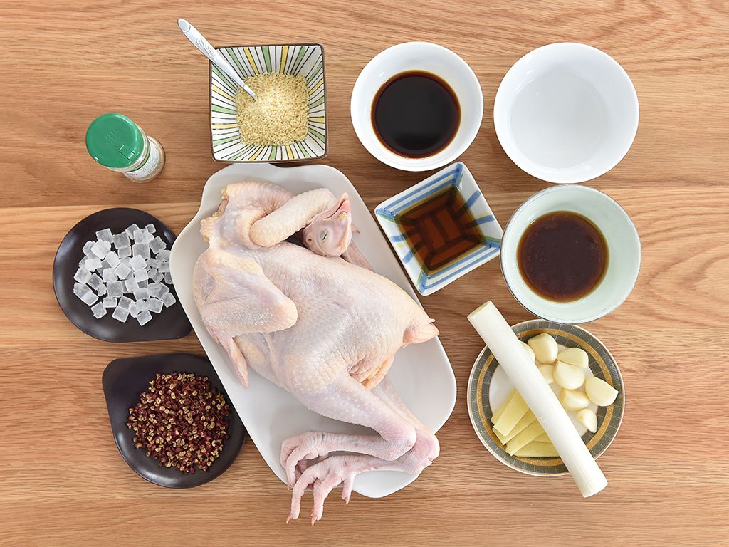 将鸡切块过水,葱、姜洗净,葱切段,所有配料洗净。鸡腿沥干,抹上调料及葱、姜,移入蒸锅以大火蒸约20~25分钟,取出待凉,汤汁留下备用