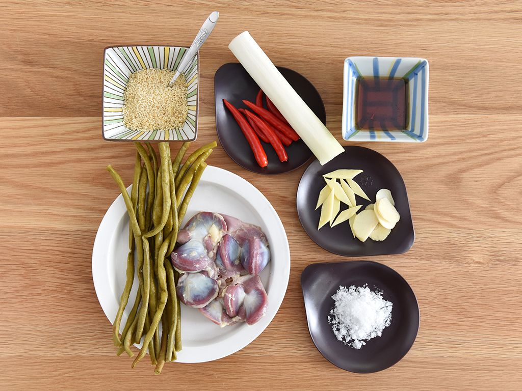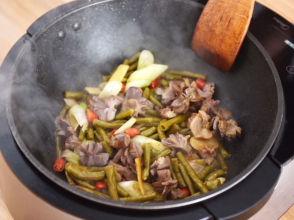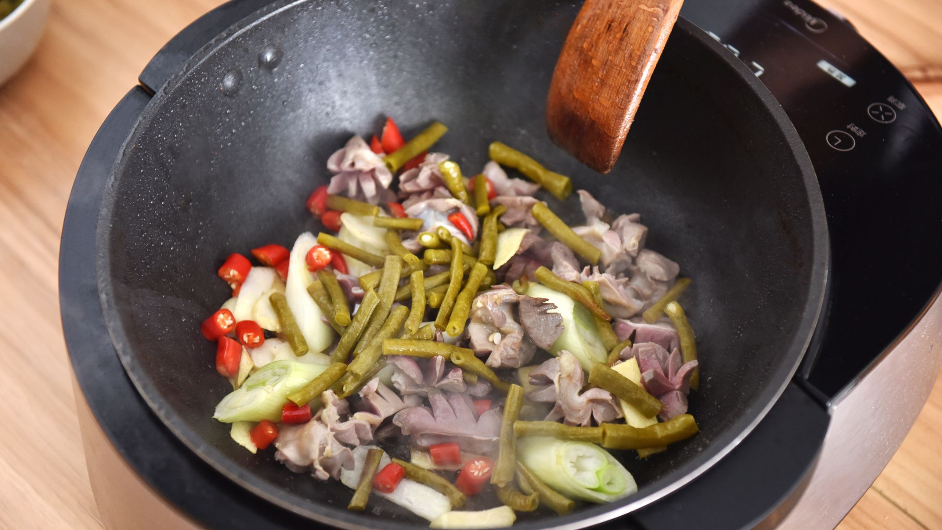 锅中倒油烧热,放入姜、蒜炒香,加入酸豆角、鸡胗翻炒,再加入酱油、料酒、盐、糖、鸡精炒匀