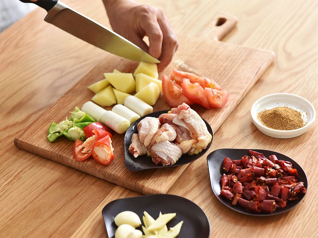 鸡切块过水,洋葱切丝、土豆切块,西红柿切块,青椒去籽切片,红椒去籽切块