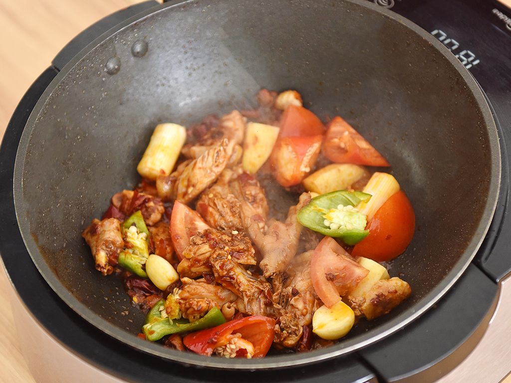 放入土豆翻炒一会儿,就可以加盐了,放完盐,加入干辣椒,炒两下就可以加水了,量自己掌握,可以放一半,也可以跟食材差不多齐平。 烧开,关小点火,盖上盖焖10-15分钟,鸡肉焖的差不多便可以放入青椒,大火翻炒几下加香菜等就可以出锅了