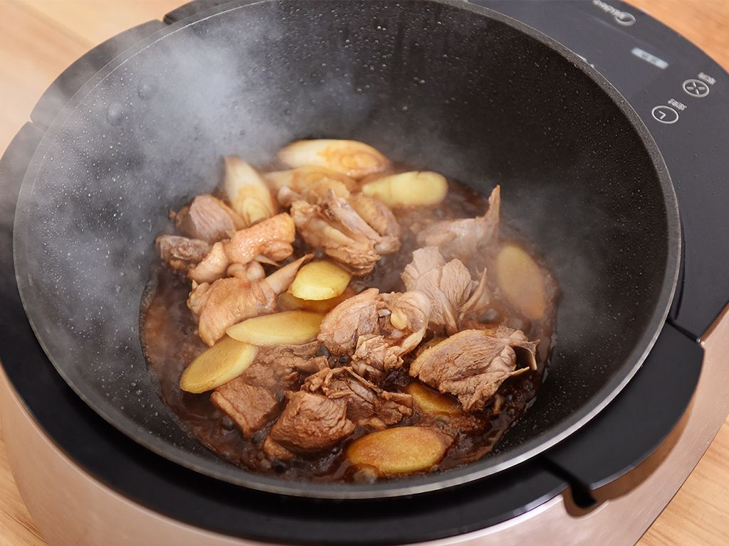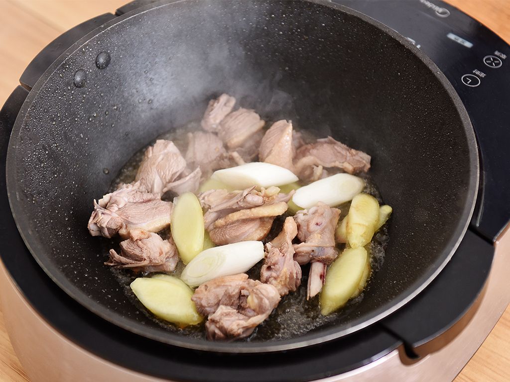 锅里放少许油,煸炒鸭肉,一定要让鸭皮表面的油逼出来,再放酱油上色,炒到沥干,加开水慢火翻滚,将鸭肉炖熟。