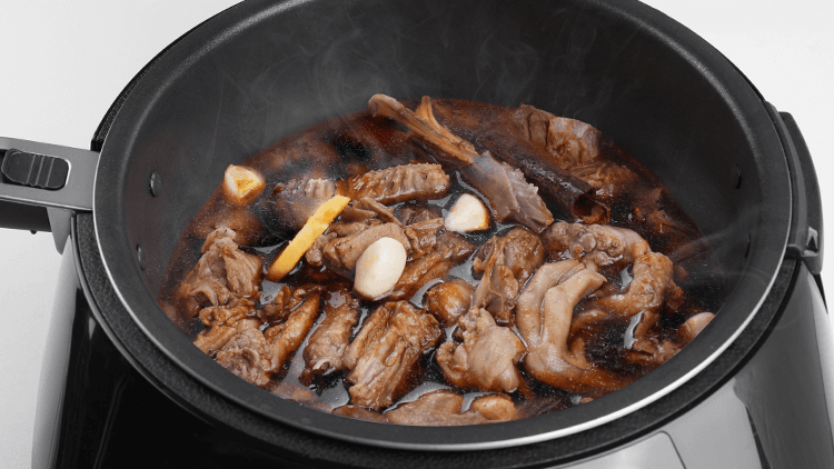 1、放入鸭肉、老抽 0.5大勺、生抽 1.5大勺。